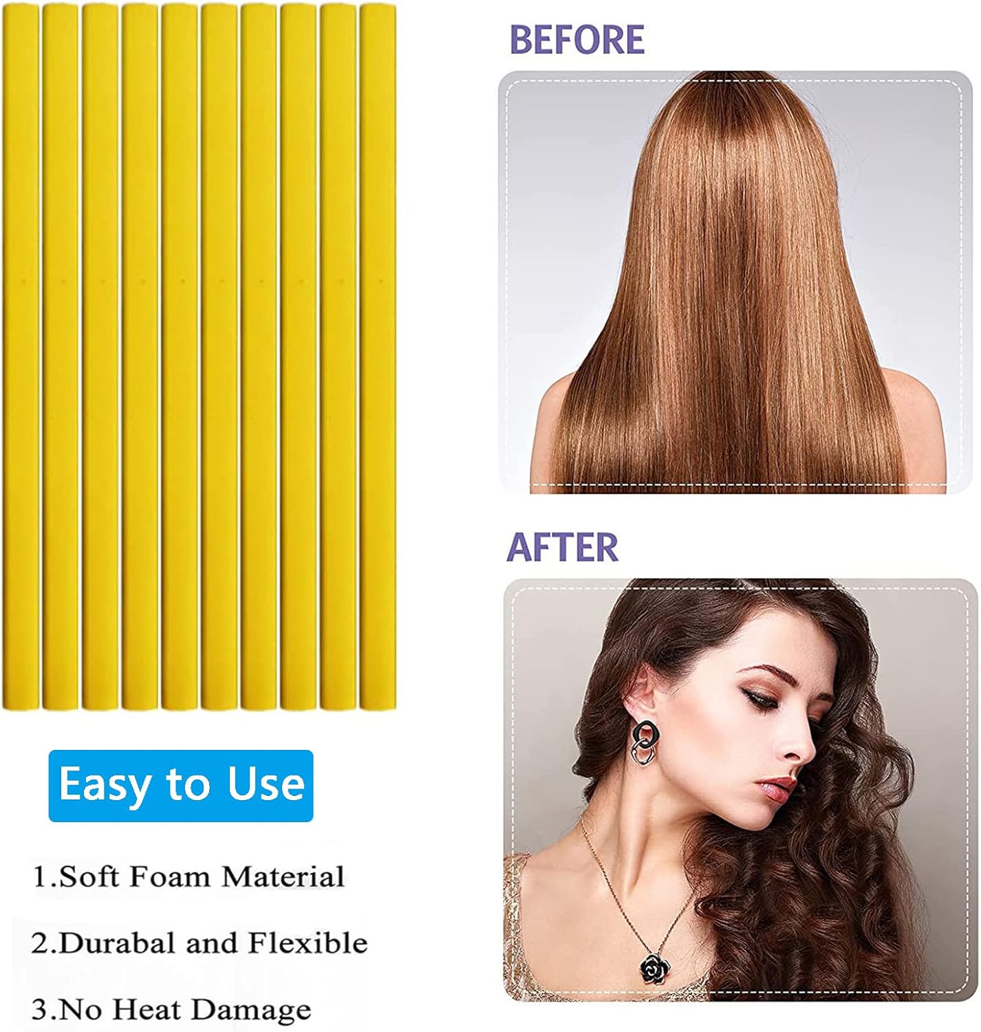 Eenvoudig te gebruiken: wikkel je haar gewoon om de draaiende schuimkrulstangen, laat je haar aan de lucht drogen of föhnen, verwijder vervolgens de krultang om je styling te voltooien. Deze haarrollers zijn geschikt voor alle natte en droge haartypes en zonder het haar te beschadigen. Het flexibele strijkijzer in de staaf is flexibeler en veelzijdiger om aan verschillende krulvereisten te voldoen.
