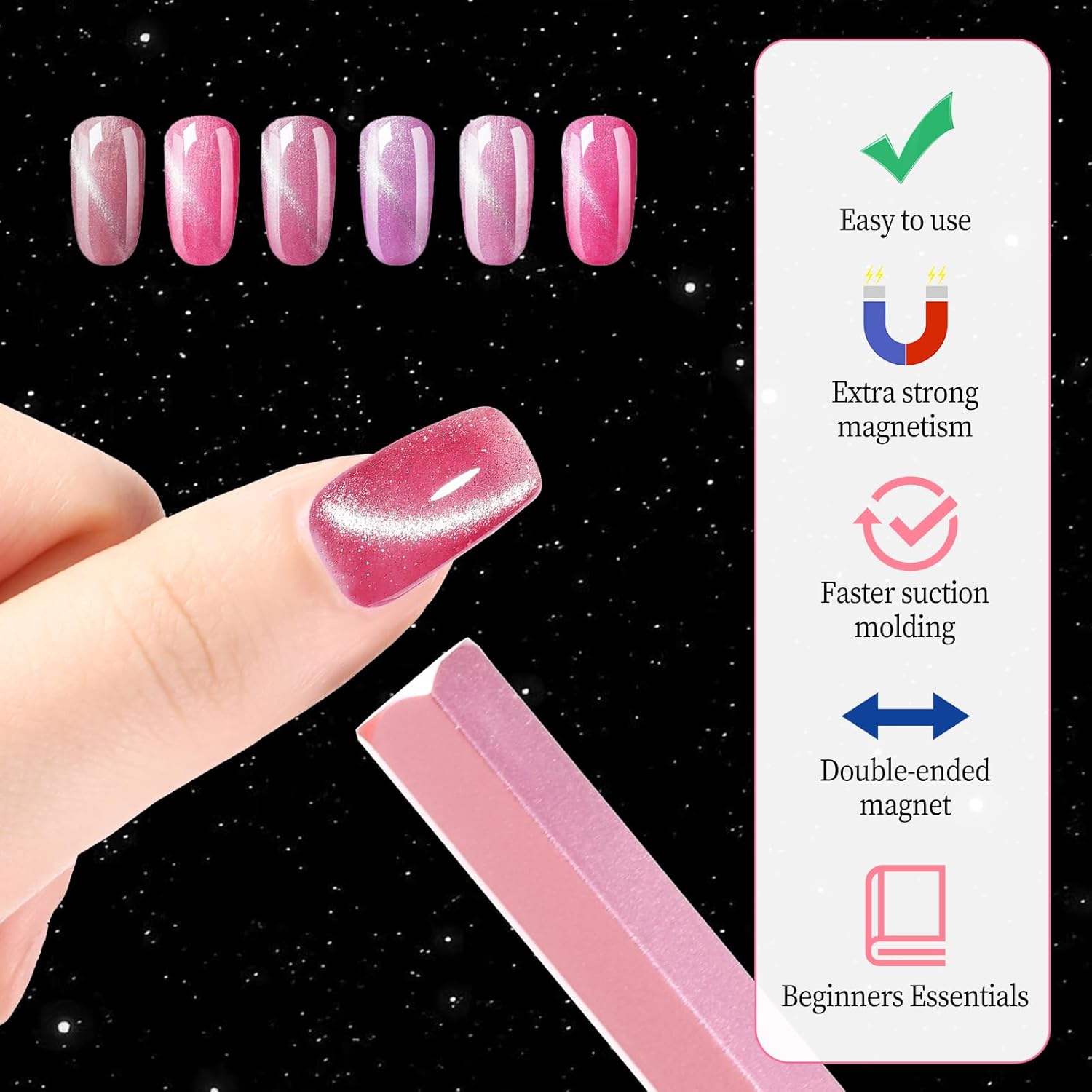 【Zeshoekige magnetische toverstaf】Onze kattenoogmagneet voor nagels is ontworpen om verbluffende kattenoogeffecten op je nagels te creëren. De zeshoekige magneetstick zorgt voor een nauwkeurige en eenvoudige applicatie, waardoor het een must-have hulpmiddel is voor elke nagelkunstliefhebber. De dubbele nagelmagneetpennen bieden veelzijdigheid en gemak, zodat je moeiteloos verschillende patronen en ontwerpen kunt bereiken.