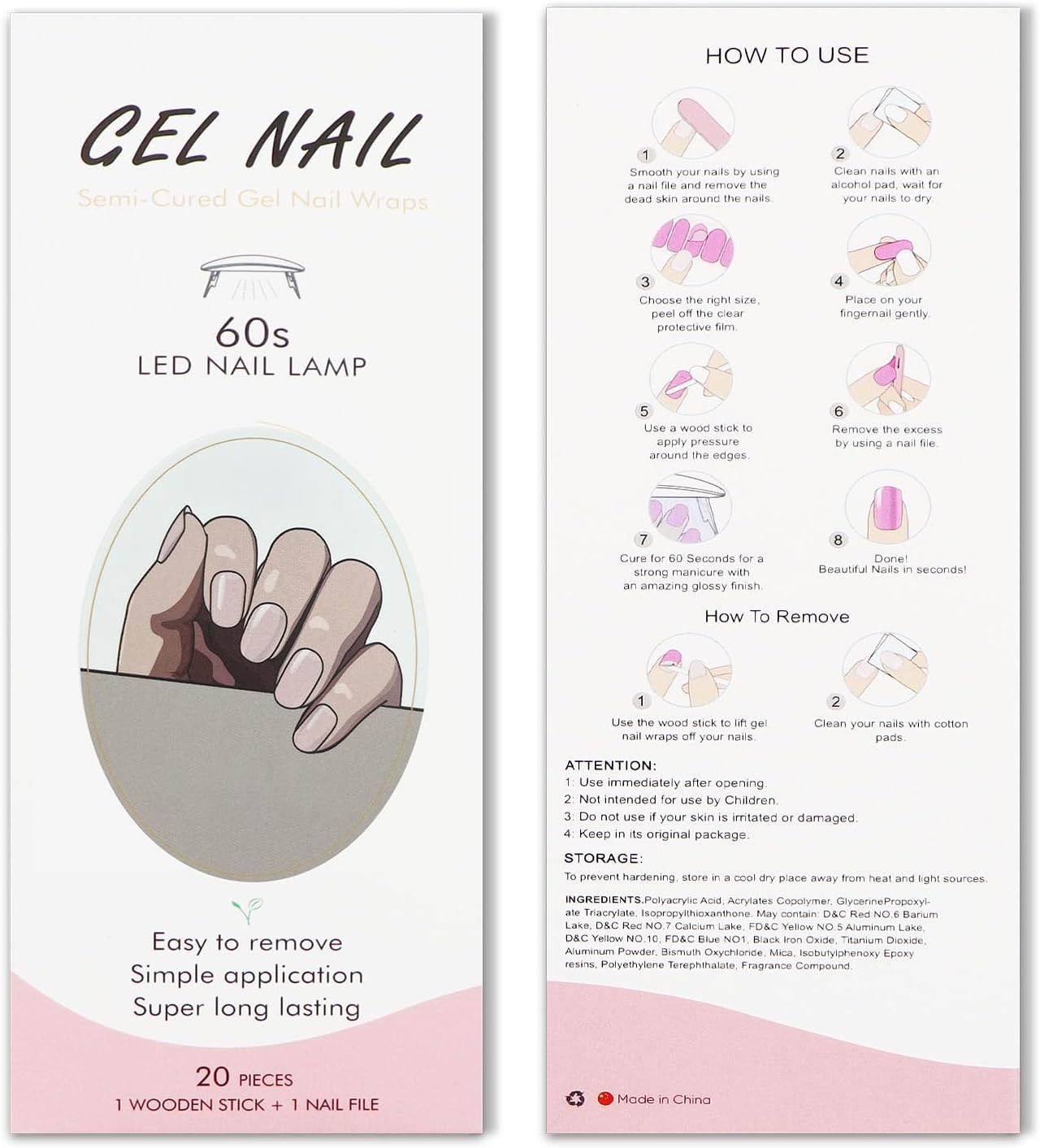 Semi-uitgeharde gelnagelstickers: gemaakt van echte gelnagellak en 60% van tevoren uitgehard, gaan tot 2 weken mee als ze volledig zijn uitgehard onder een UV/LED-lamp, en zijn comfortabel om te dragen, duurzaam, niet-giftig, onschadelijk, veilig