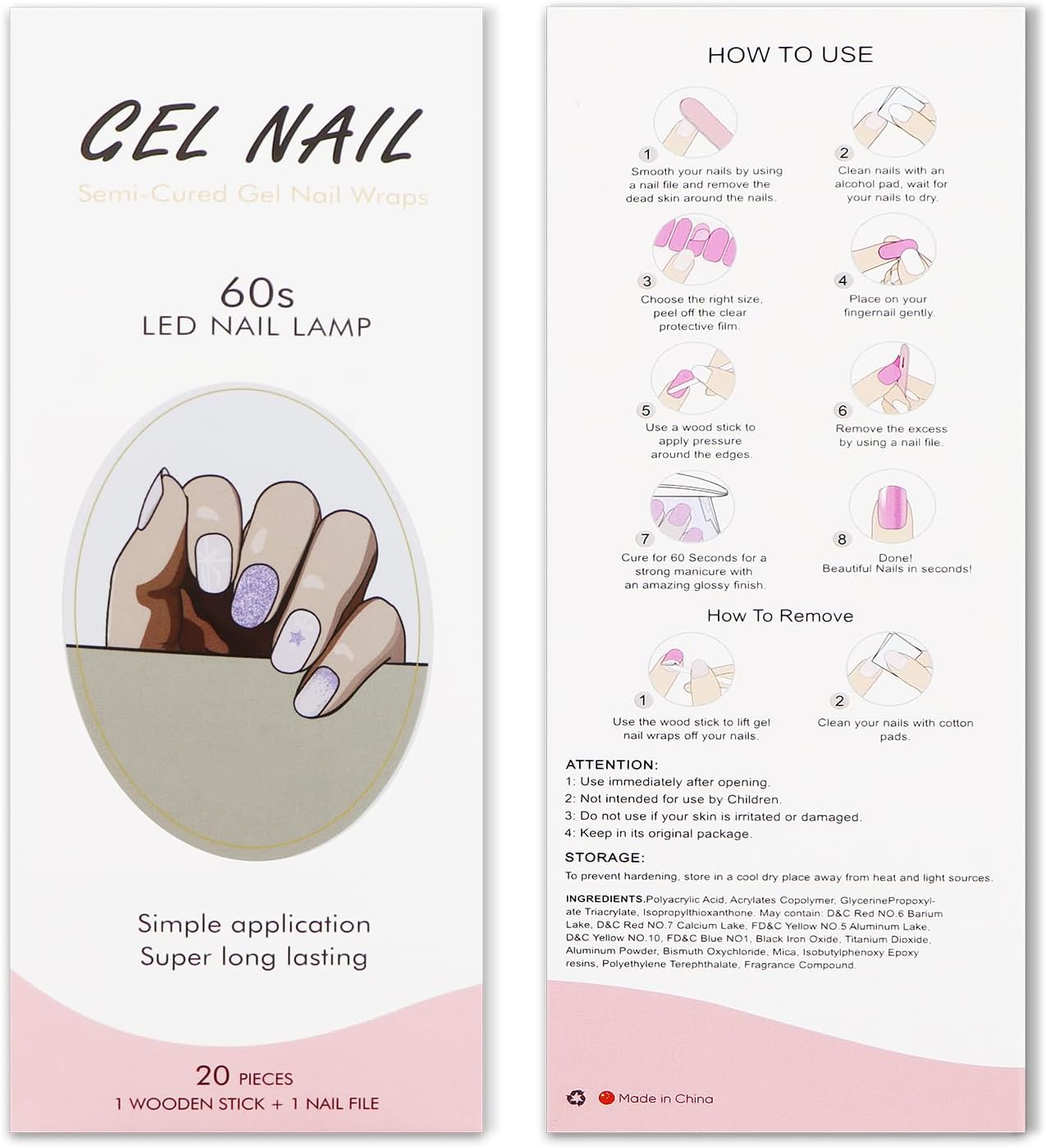 Semi-uitgeharde gelnagelstickers: gemaakt van echte gelnagellak en 60% van tevoren uitgehard, gaan tot 2 weken mee als ze volledig zijn uitgehard onder een UV/LED-lamp, en zijn comfortabel om te dragen, duurzaam, niet-giftig, onschadelijk, veilig