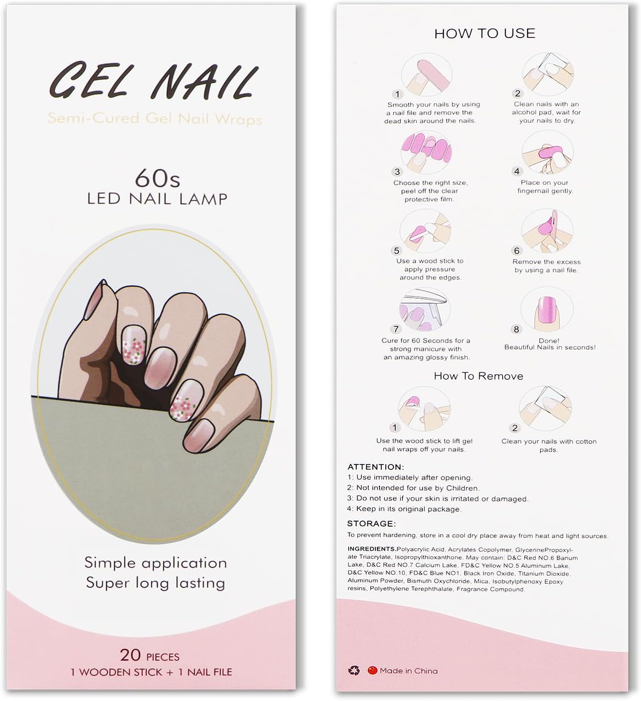 Semi-cured gel nail stickers: made of real gel nail polish and 60% pre-cured, last up to 2 weeks when fully cured under UV/LED lamp, and are comfortable to wear, durable, non-toxic, harmless, safe