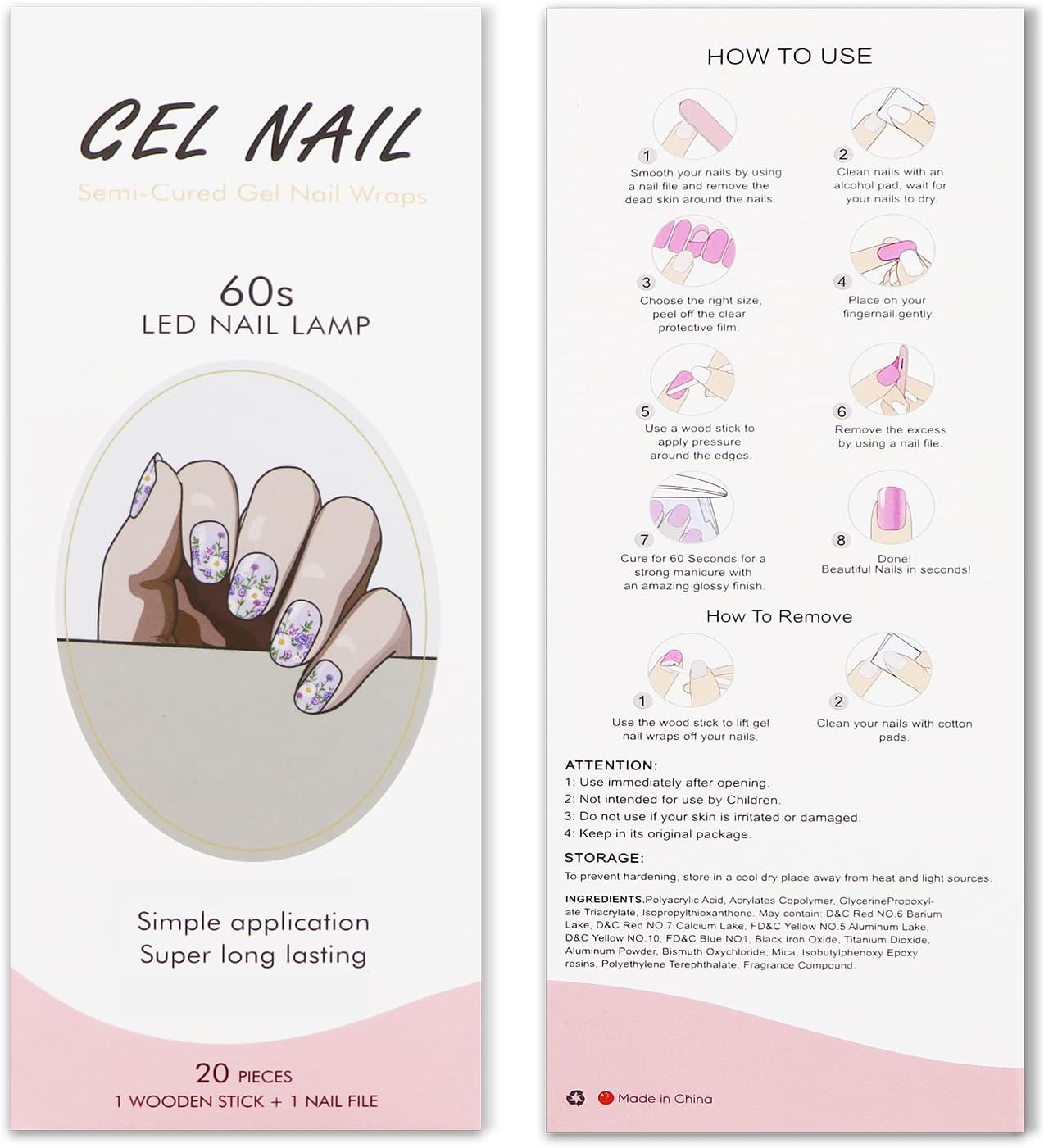 Semi-cured gel nail stickers: made of real gel nail polish and 60% pre-cured, last up to 2 weeks when fully cured under UV/LED lamp, and are comfortable to wear, durable, non-toxic, harmless, safe