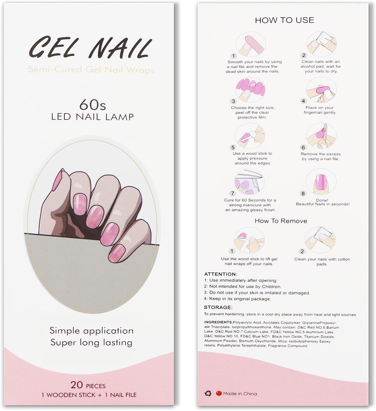 Semi-uitgeharde gelnagelstickers: gemaakt van echte gelnagellak en 60% van tevoren uitgehard, gaan tot 2 weken mee als ze volledig zijn uitgehard onder een UV/LED-lamp, en zijn comfortabel om te dragen, duurzaam, niet-giftig, onschadelijk, veilig