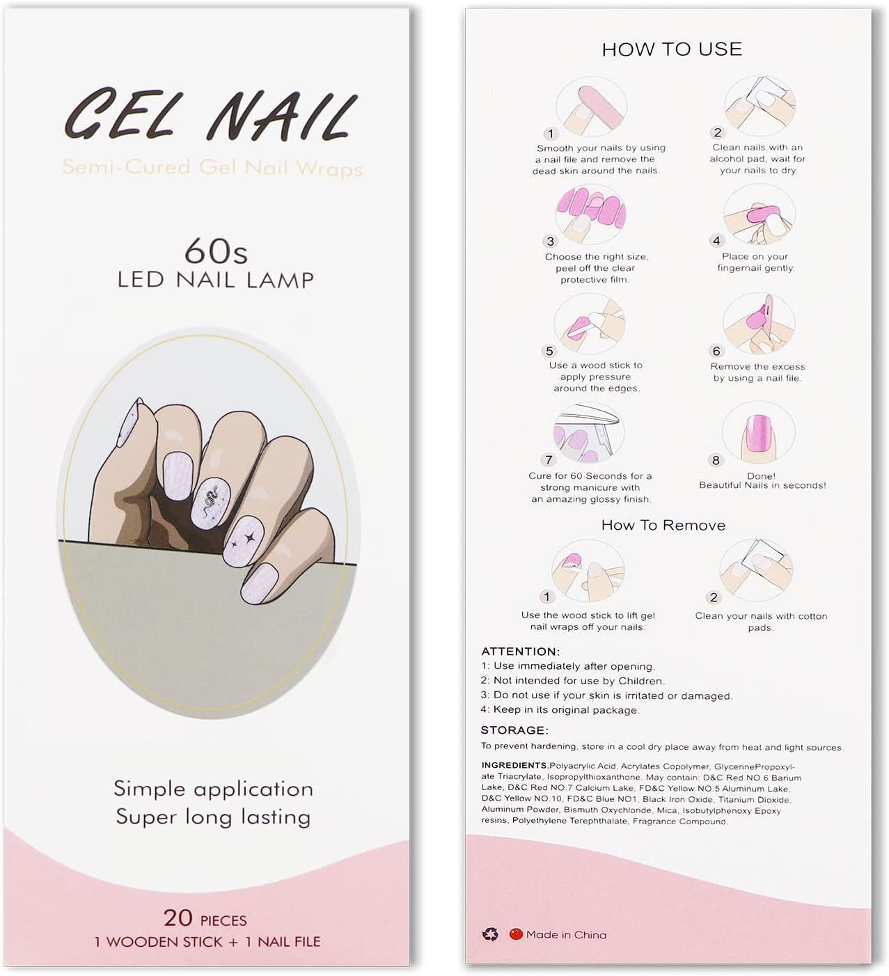 Semi-uitgeharde gelnagelstickers: gemaakt van echte gelnagellak en 60% van tevoren uitgehard, gaan tot 2 weken mee als ze volledig zijn uitgehard onder een UV/LED-lamp, en zijn comfortabel om te dragen, duurzaam, niet-giftig, onschadelijk, veilig