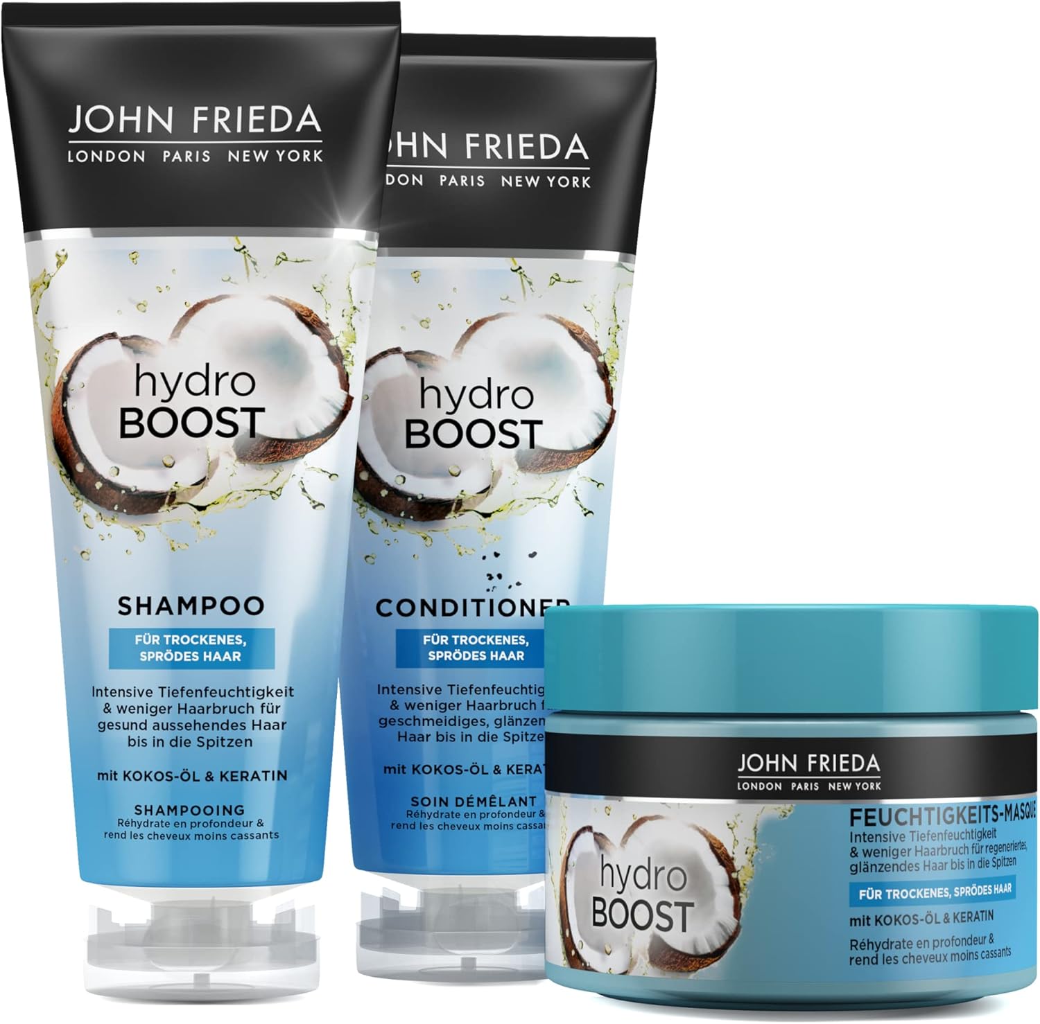 De nieuwe John Frieda Hydro Boost-lijn is ontwikkeld om het vocht van het haar te herstellen en het tegelijkertijd van binnenuit te herstellen. De unieke formule, die de rijke werkzame stoffen van kokosolie combineert met de herstellende eigenschappen van keratine, werkt als een vochtopslag die vocht in elke haarvezel inhoudt.