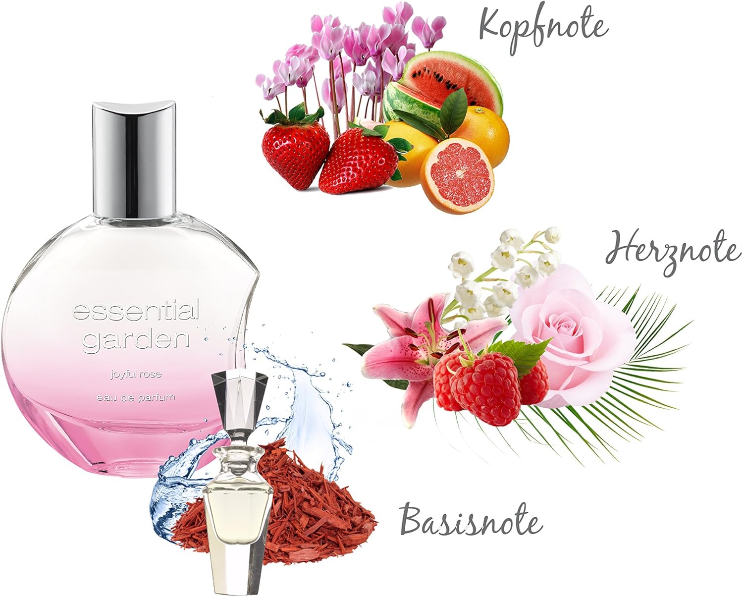 De creatie verspreidt een aangename touch van verse rozen en combineert deze met lieflijke vruchten van de vroege zomer. Pure levensvreugde en gelukzaligheid omhullen de draagster en geven haar een vleugje paradijs.