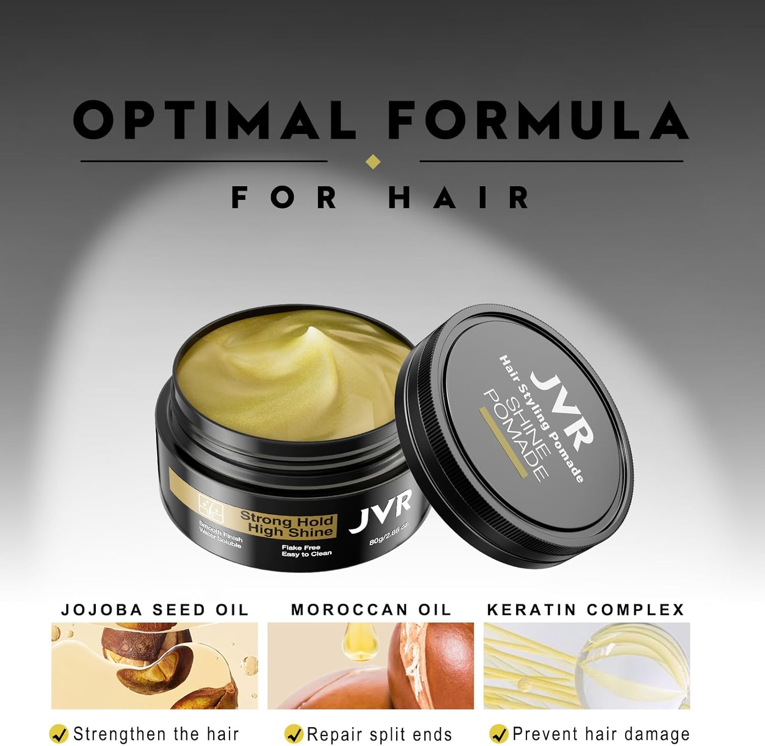 Repairs and prevents damage: contains keratin and jojoba seed oil that moisturizes hair. It helps prevent hair from becoming too dry or brittle, strengthens the hair and repairs split ends and promotes a healthier texture. JVR Pomade keeps your hair in top condition with a formula developed to prevent damage.