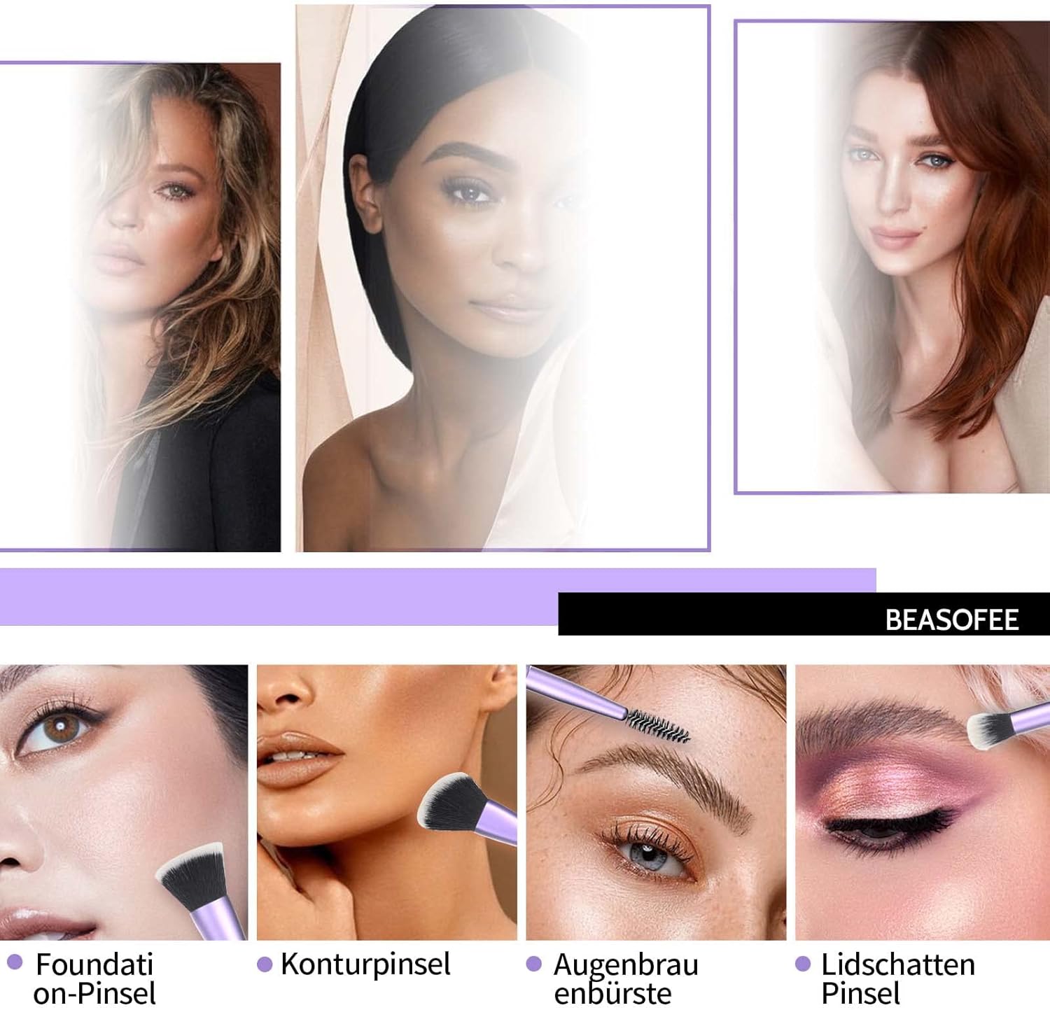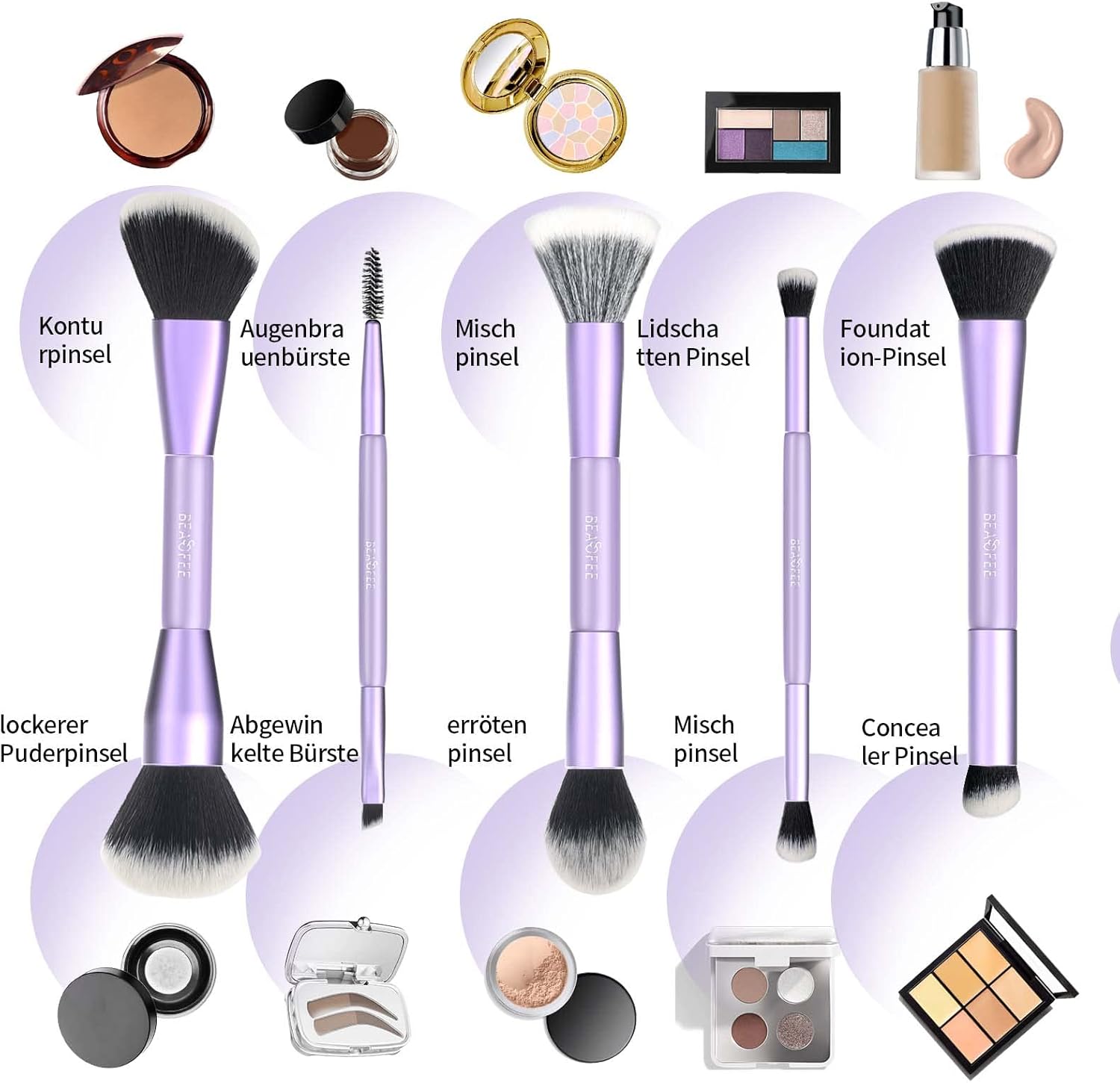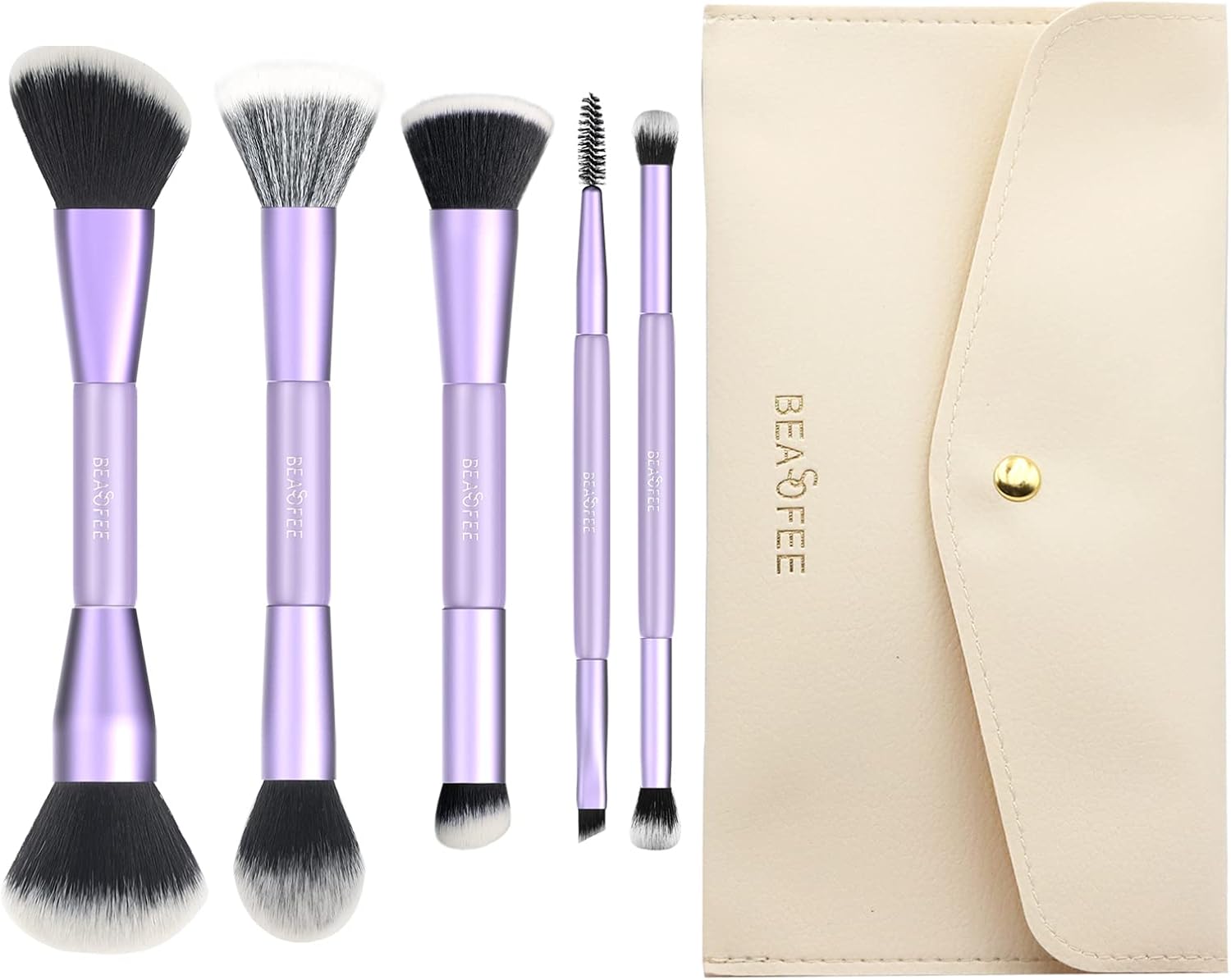 Eenvoudig te dragen: mooie paarse opbergtas, eenvoudig op reis te dragen, gemakkelijk te onderhouden en te reinigen, goede bescherming. Set van 5 dubbelzijdige foundationkwasten, rouge kwast, blush kwast, contourkwast, bronzer kwast, poederkwast, in een popy en klassiek paars, dat er zo chique en stijlvol uitziet, een must in je make-uptas