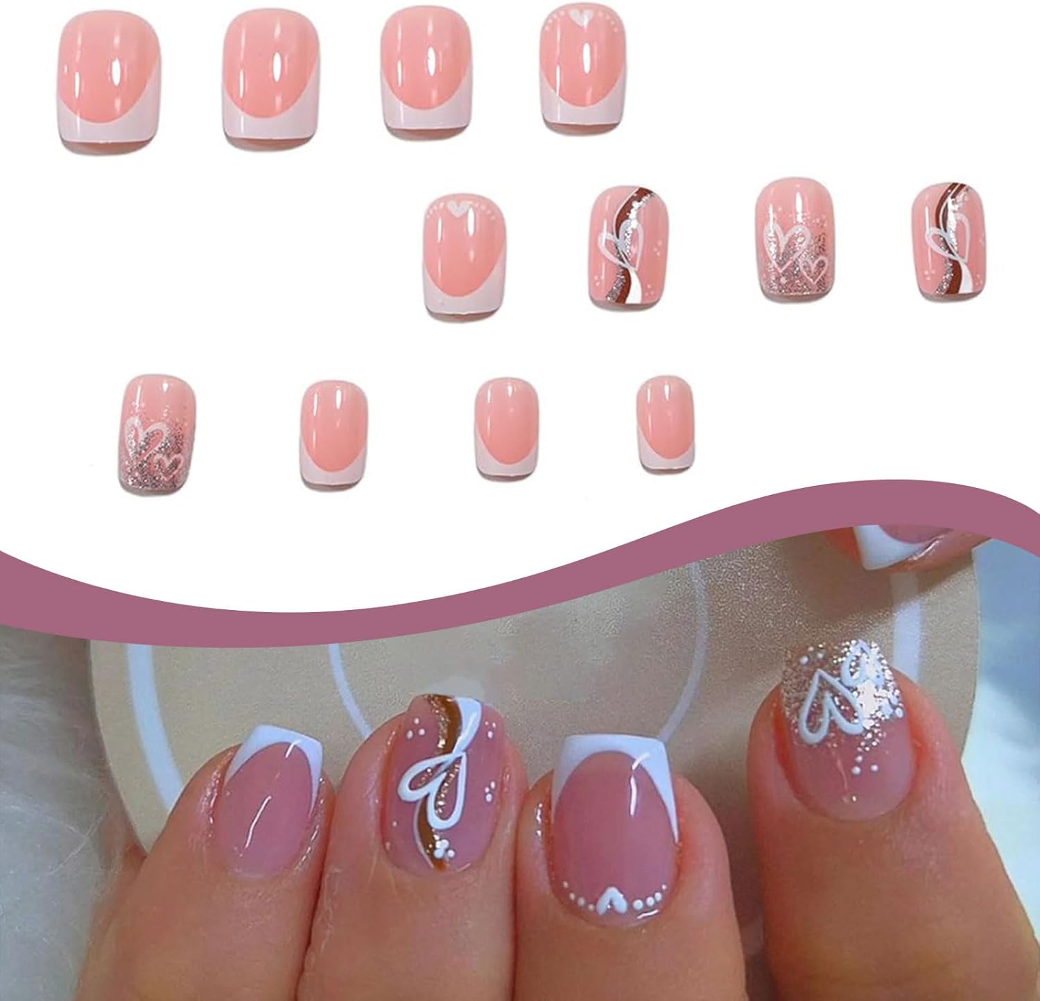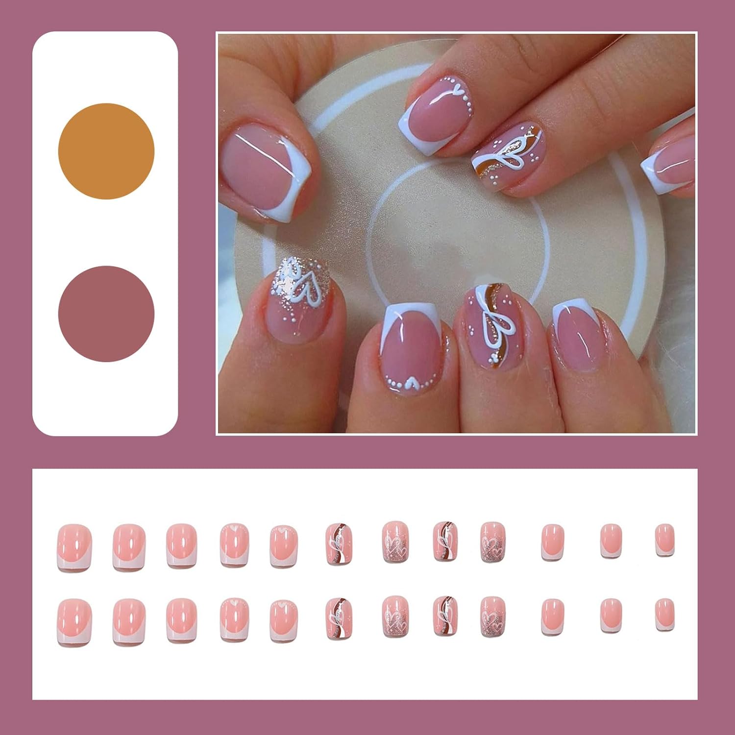 Kabwea 24pcs White French Tip Press on Nails, Short Square False Nails with Glitters, Fake Nails, Press on Nails, Nails to Stick on