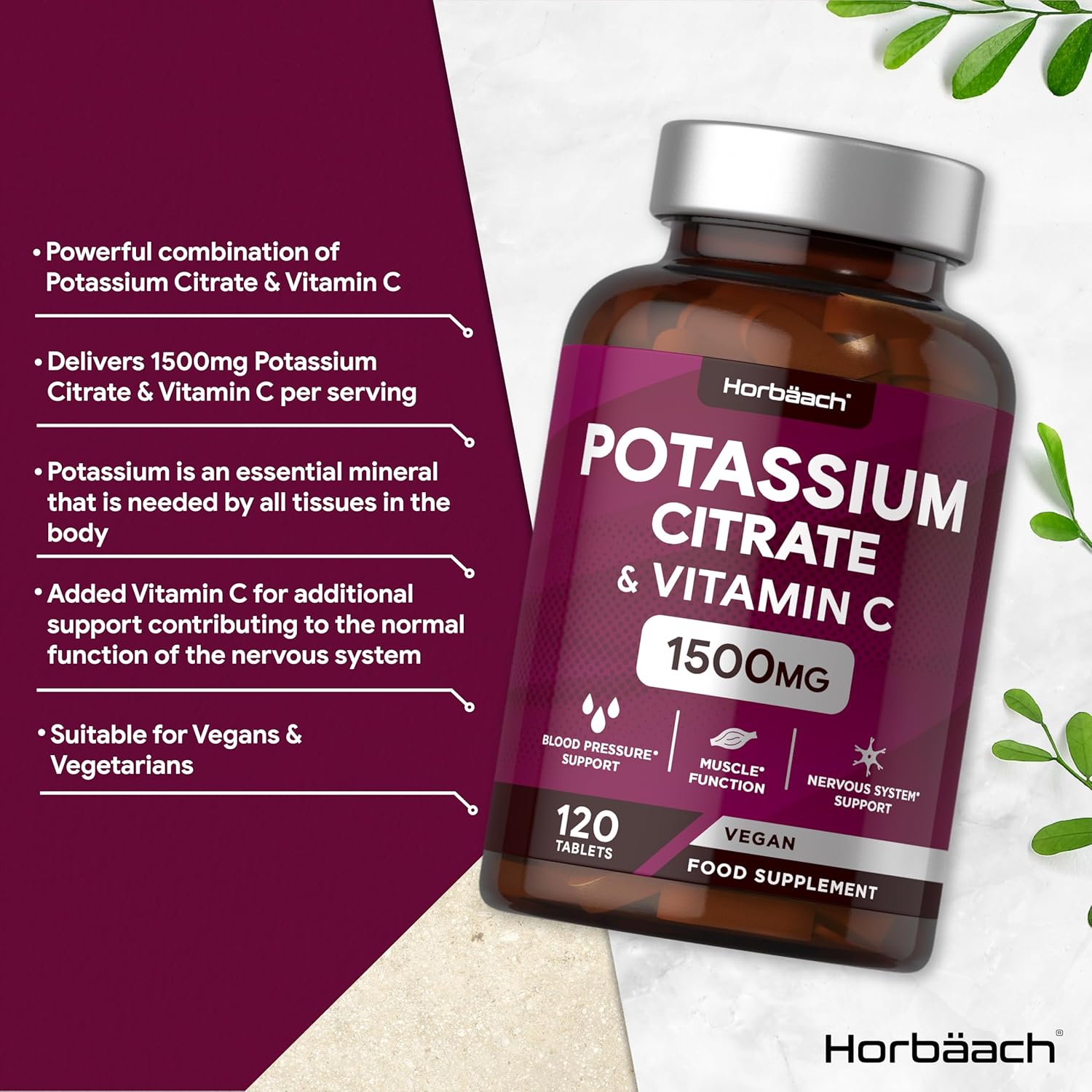 Kalium Citraat Supplement met Vitamine C 1500mg | 120 Vegan Tabletten | Kaliumcitraat supplement | Potassium Citrate with Vitamin C | Horbaach
