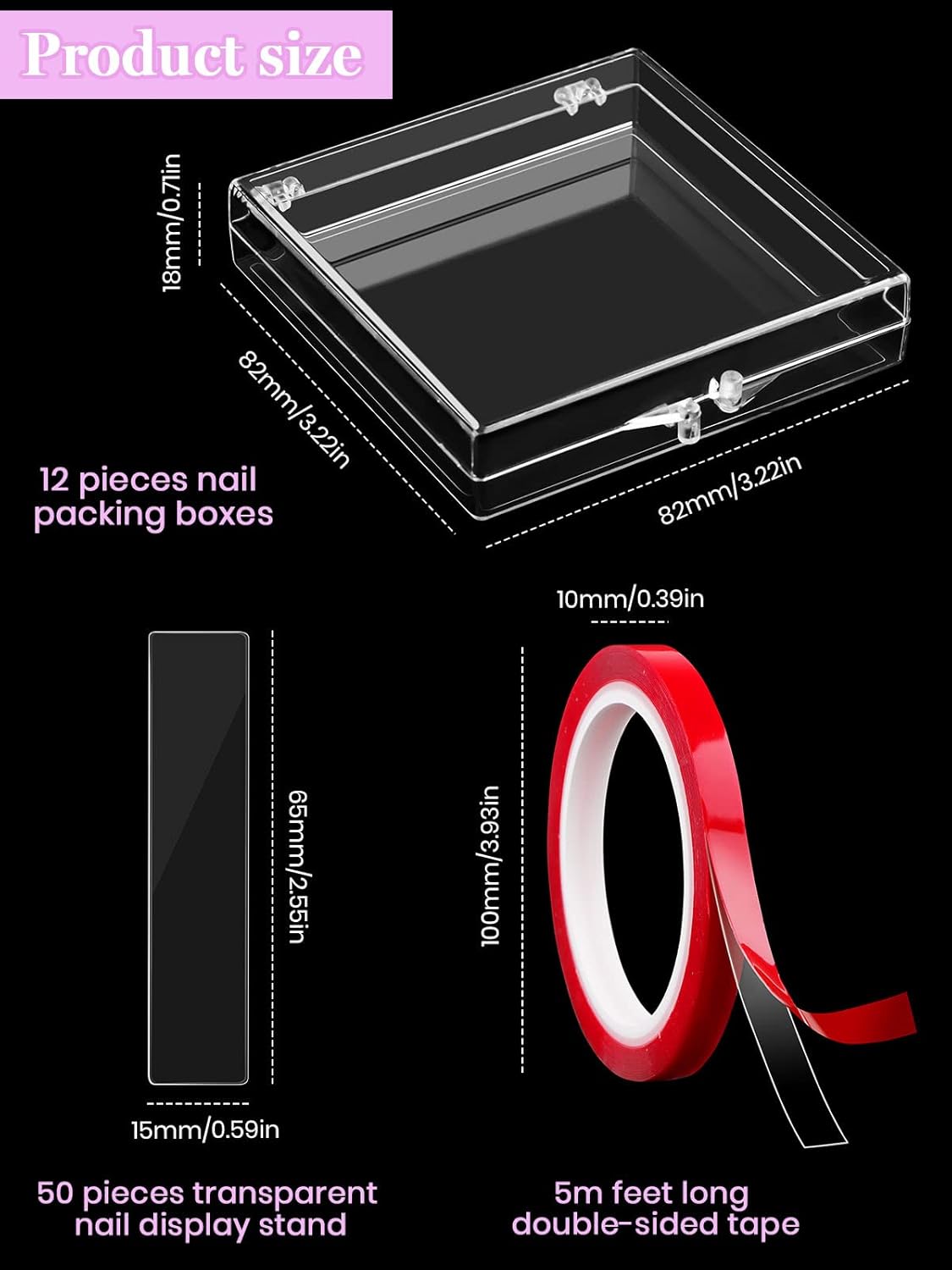 【Nail Packaging Box Set】: je ontvangt een perfecte pers op de nagelverpakkingsset, inclusief 12-delige verpakkingsdozen, 50-delige transparante nagelstandaardhouders en 1 rol 5 m lange dubbelzijdige tape, voldoende hoeveelheden voldoen aan je dagelijkse behoefte. Houd er rekening mee dat valse nageltips niet zijn inbegrepen.
