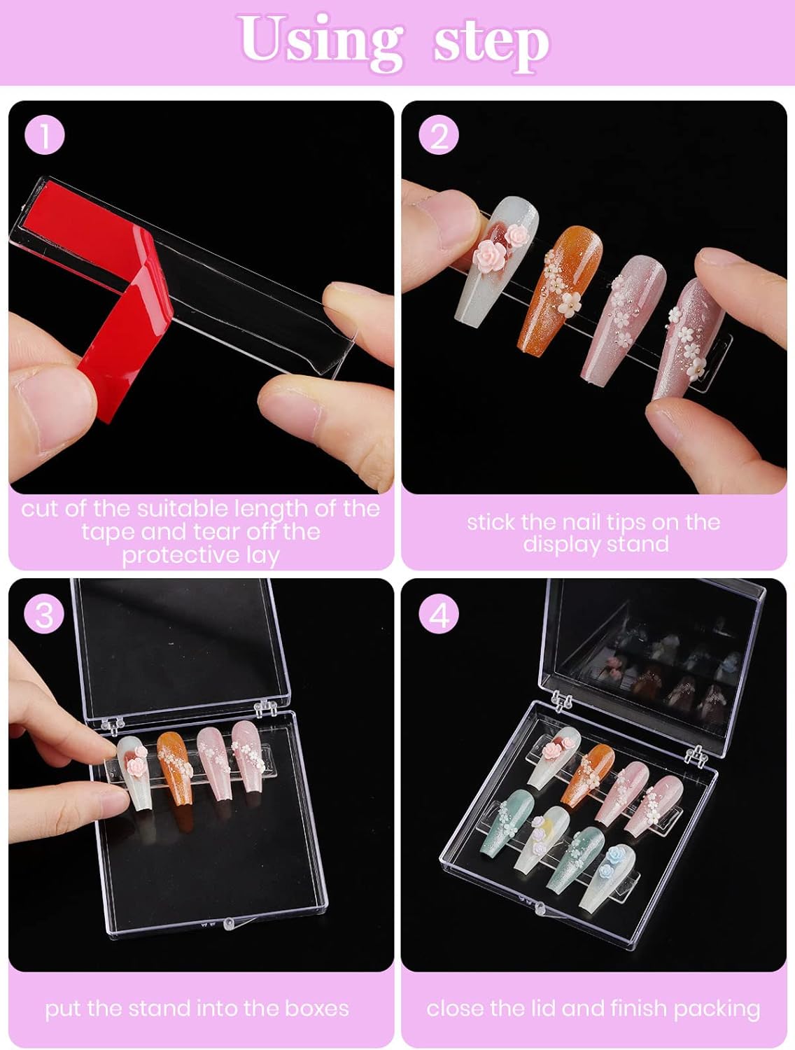 【Luxe nageldisplay】: knip de dubbelzijdige tape op de juiste lengte, plak deze op de 2 zijden van de nagelstandaardhouder, plak vervolgens het afgewerkte, prachtig ontworpen manicure-nepnagelstuk erop en plaats het in de verpakkingsdoos, een eenvoudig object die met een simpele handeling het effect van manicure kan weergeven.