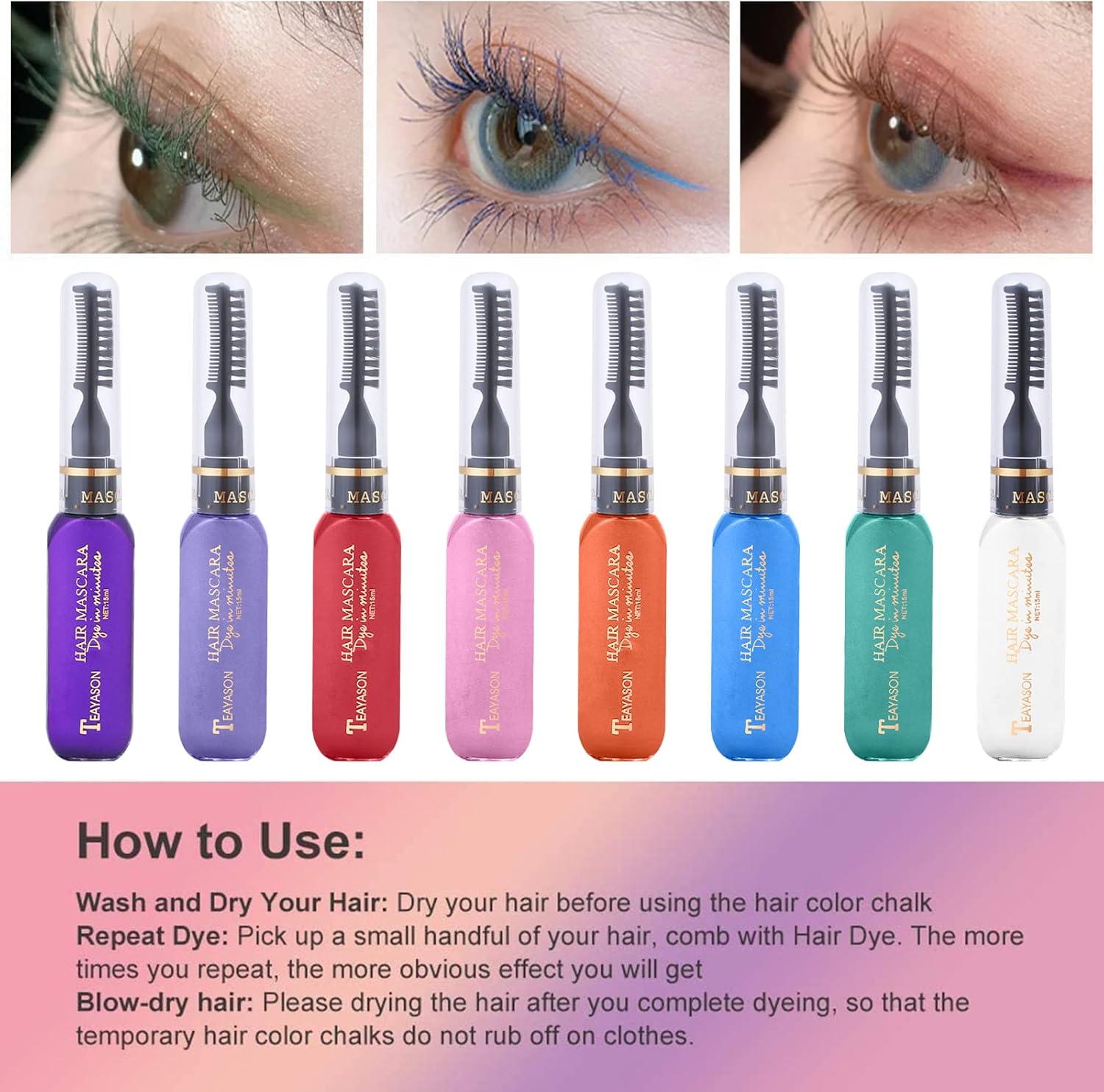 Muitifunctie: de haarkleurkam verandert de haarkleur in enkele minuten. Haarkrijt kam Perfect voor het verzamelen van vrienden, cosplay, campusactiviteiten voor kinderen of het verven van hondenhaar enz. Kan ook als gekleurde mascara worden gebruikt. Omdat deze kleuren niet duurzaam zijn, kun je je nieuwe look zo lang behouden als je wilt.