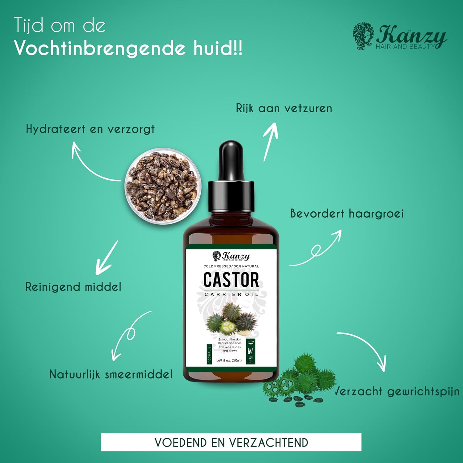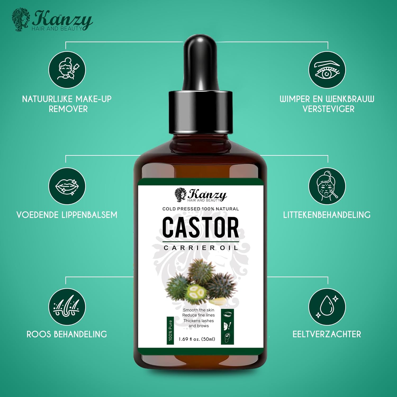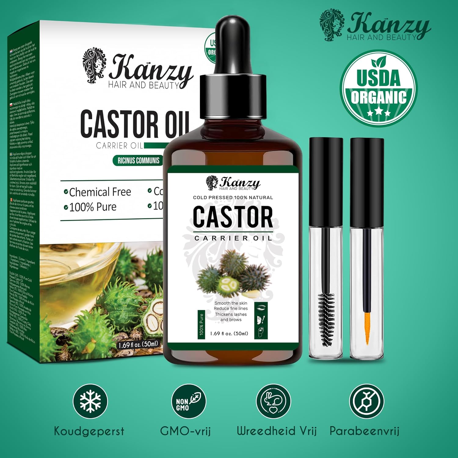 Kanzy Biologische Castorolie voor Wimpers en Wenkbrauwen Koudgeperste Castorolie voor Haargroei 100% Natuurlijke en Pure Castorolie met Borstels voor Haar, Baard, Nagels en Huid (50 ml, Wonderolie)