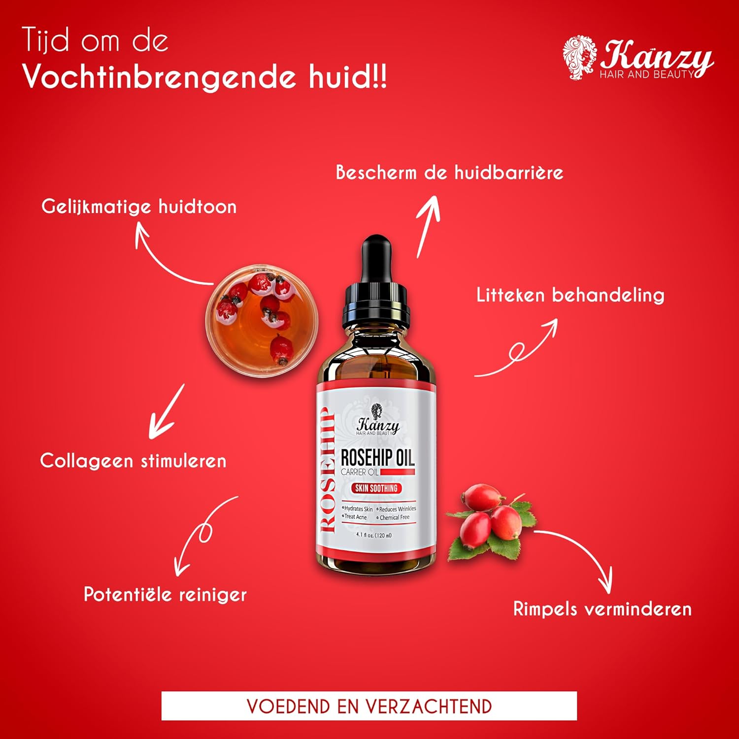 Premium kwaliteit Kanzy biedt 100% pure rozenbottelpitolie, veganistisch en vrij van dierproeven. Onze rozenolie hydrateert en voelt zijdezacht aan en heeft een delicate geur. Het vermindert striae en littekens voor een gladde, frisse huid.