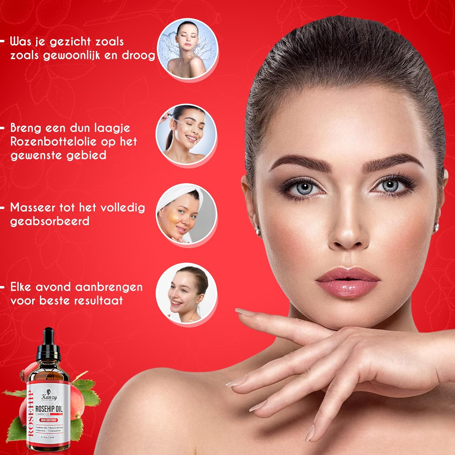 Kanzy Rozenbottelolie Pure 100% Biologische Koud Geperst 120ML, Rosehip Oil Veganistische Behandeling voor Huid, Gezicht, Haar, Nagels met Rijke Vitamins (120ml)