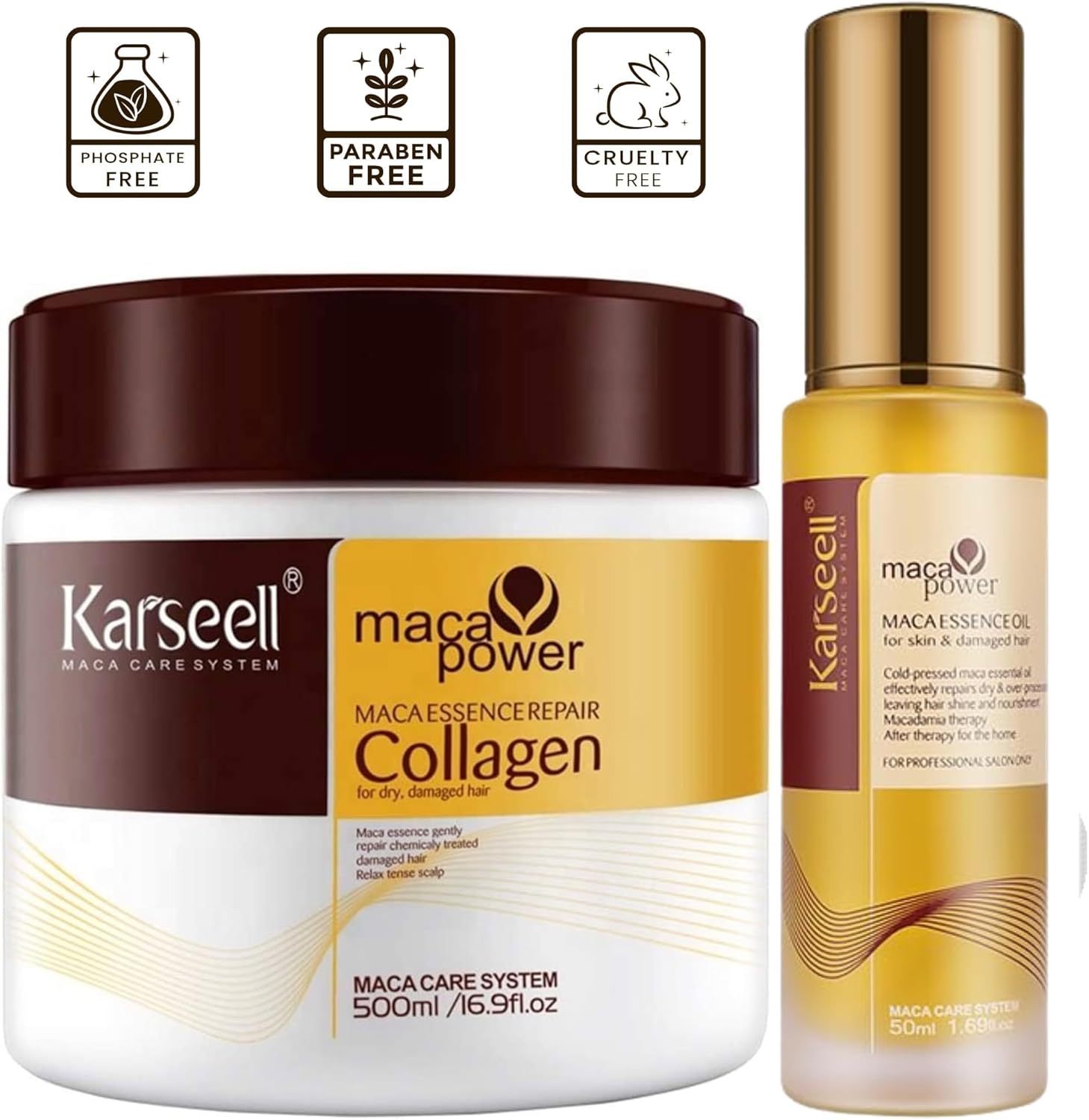 Karseell MACA CARE SYSTEEM – Pakket 2u. 1 Haarmasker 500 ml. + 1 Arganolie 50 ml. – Droog en beschadigd haar – Collageen – Maca – Hydratatie – Herstellende behandeling – Alle haartypes