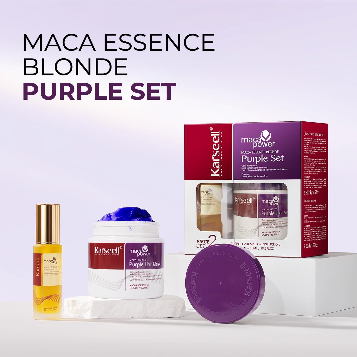 Karseell Purple Haarmasker en haarolieset, neutraliseert gele zweem, herstelt haarschade voor blond en grijs haar, 50 ml + 500 ml