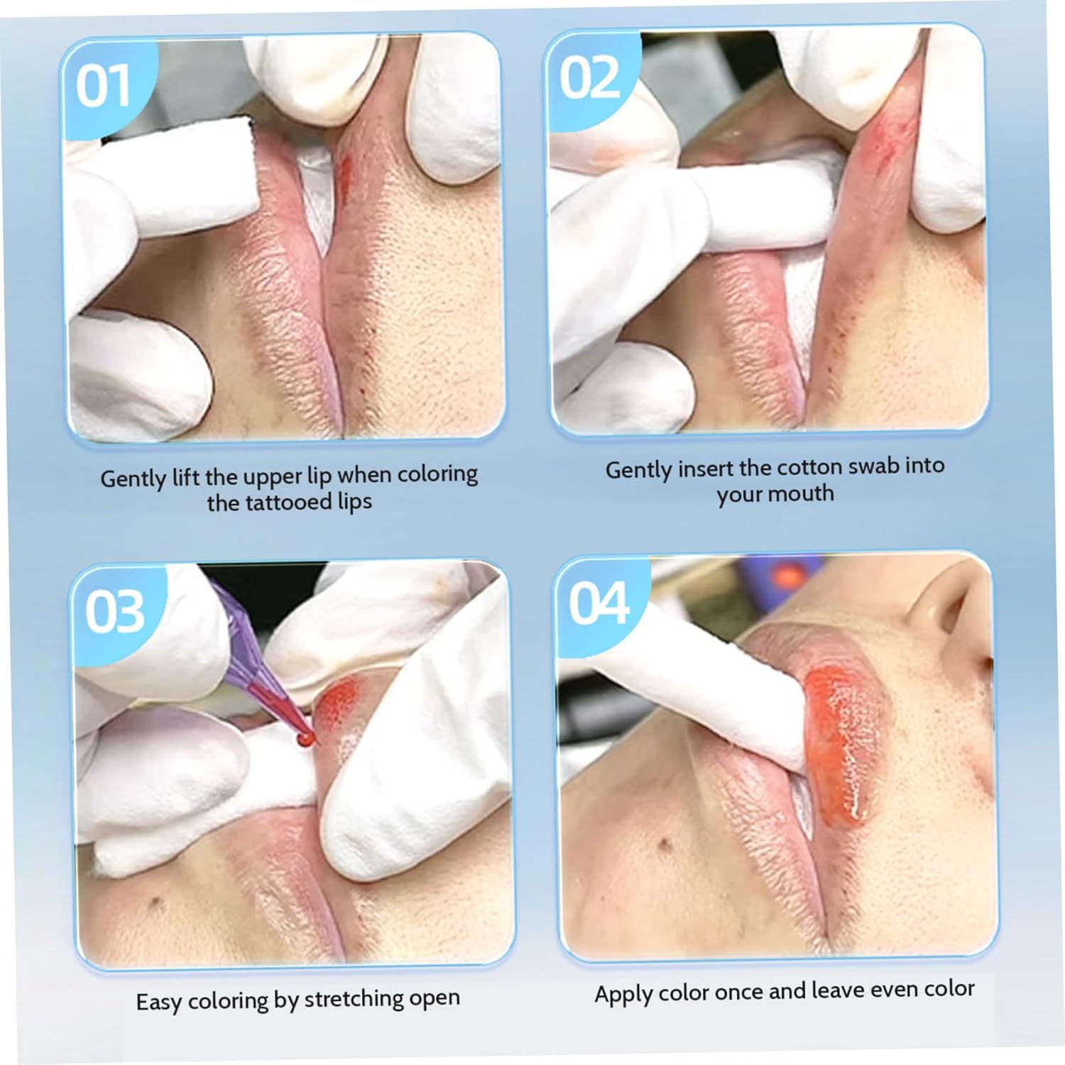 Materiaal: Lipblozende benodigdheden zijn gemaakt van zacht en duurzaam absorberend katoen, dat mollig en stevig is zonder eraf te vallen, veilig en schoon in gebruik, zacht voor de huid, waardoor het ongemak van klanten tijdens het tattooproces wordt geminimaliseerd.