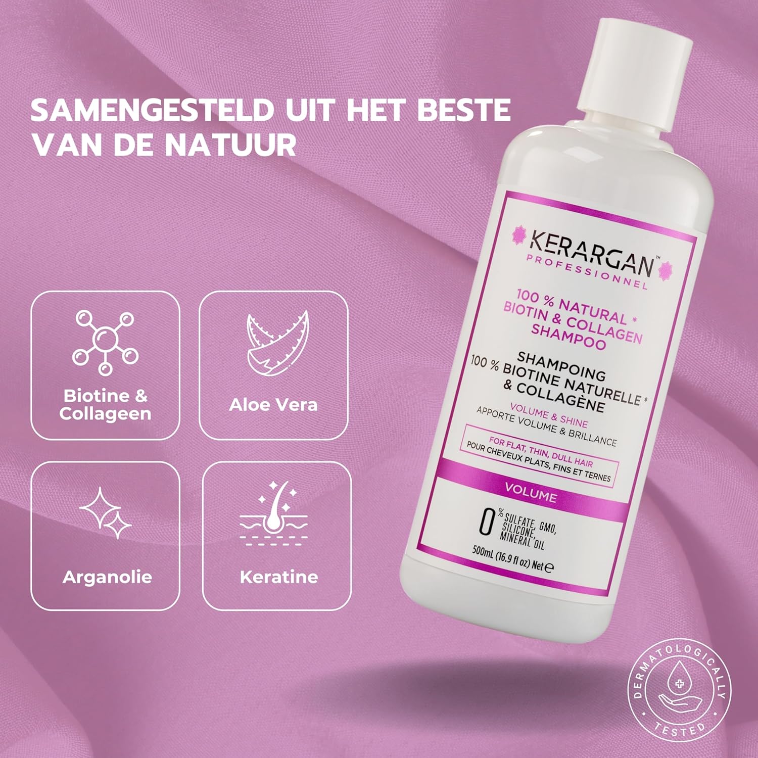 Kerargan – Volumiserende Shampoo met Biotine & Collageen – Voor Plat, Fijn, Dof Haar – Versterkend, Glanzend, Hydraterend – Zonder Sulfaat, GMO, Siliconen, Minerale Olie – 500ml
