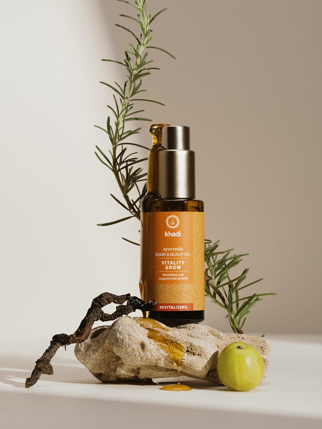 khadi Vitality Grow Haarolie, 100% Natuurlijk, Plantaardig & Veganistisch, Rozemarijn voor Meer Volume & Haargroei, Tegen Haaruitval, Siliconen & Parabenenvrij, Ayurvedische Haarverzorging Biologische Natuurlijke Cosmetica 50 ml