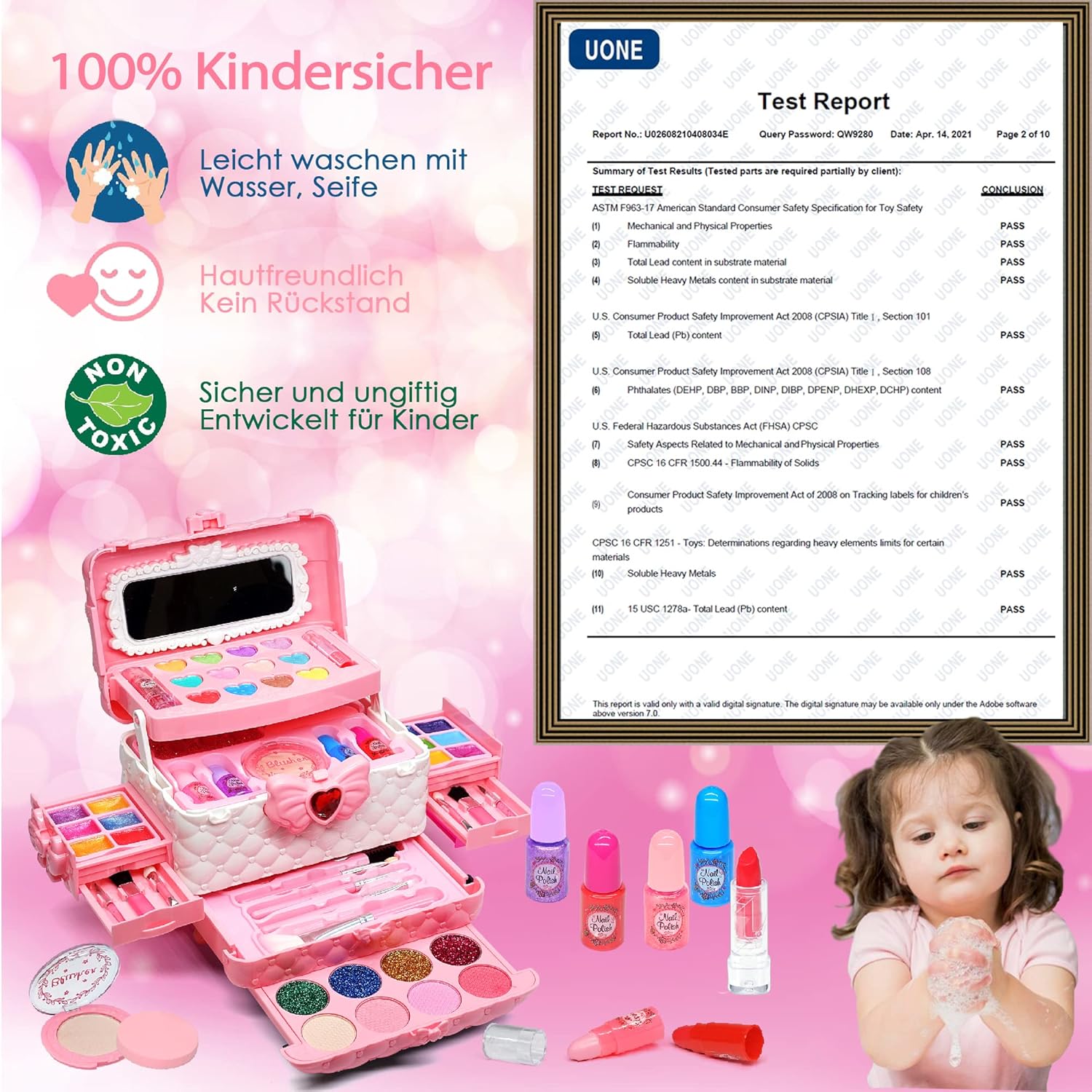 🎀Leuke schminkset voor kinderen – Onze 57 PCS schminkset voor kinderen is een geweldige startset voor je kleintje. Hij bevat alles wat een klein meisje zich kan wensen bij het spelen met make-up. Oogschaduw, blush, lippenstift, nagellak, foundation, make-up kwast, nagelvijl, nagelscheider, nagelstickers, 4 oogschaduw- en blushpaletten met 32 kleuren. Onze make-up voor kinderen is “echte make-up” en maakt de kleintjes zeker enthousiast.