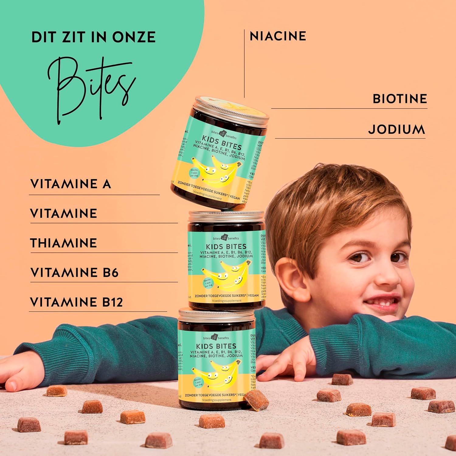 Fruit Bite Kids – Wek de fruitige energie op voor kleine helden:Met Kids Bites ontdek je een wereld waarin heerlijke fruitingrediënten zoals appelsapconcentraat en bananenpuree samensmelten tot een uniek voedingssupplement. Deze hapjes zijn niet alleen een culinair avontuur, maar ook rijk aan essentiële vitamines die de ontwikkeling van je kind ondersteunen.De uitgebalanceerde mix van vitamine A, E, B1, B6, B12, jodium en biotine stimuleert niet alleen het immuunsysteem, maar speelt ook een belangrijke rol bij de cognitieve ontwikkeling. Met vitamine C als krachtige antioxidant en B-vitamines ter ondersteuning van de stofwisseling en het zenuwstelsel zijn Kids Bites een smakelijke bondgenoot voor de dagelijkse vitamine-inname.De speciale aandacht voor jodium draagt niet alleen bij aan een normale groei, maar voorkomt ook concentratie- en leerproblemen. Kids Bites zijn niet alleen lekker, maar ook een extra bron van fruit voor kinderen dankzij het hoge fruitgehalte.Probeer nu onze Kids Bites!