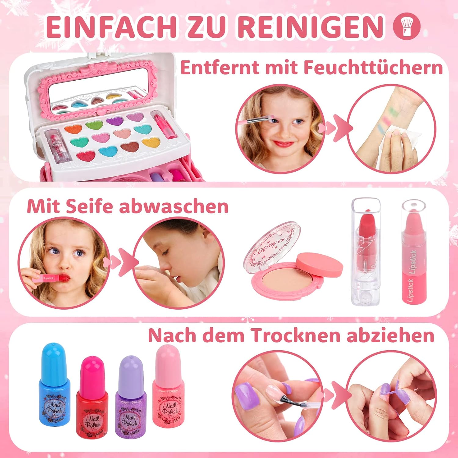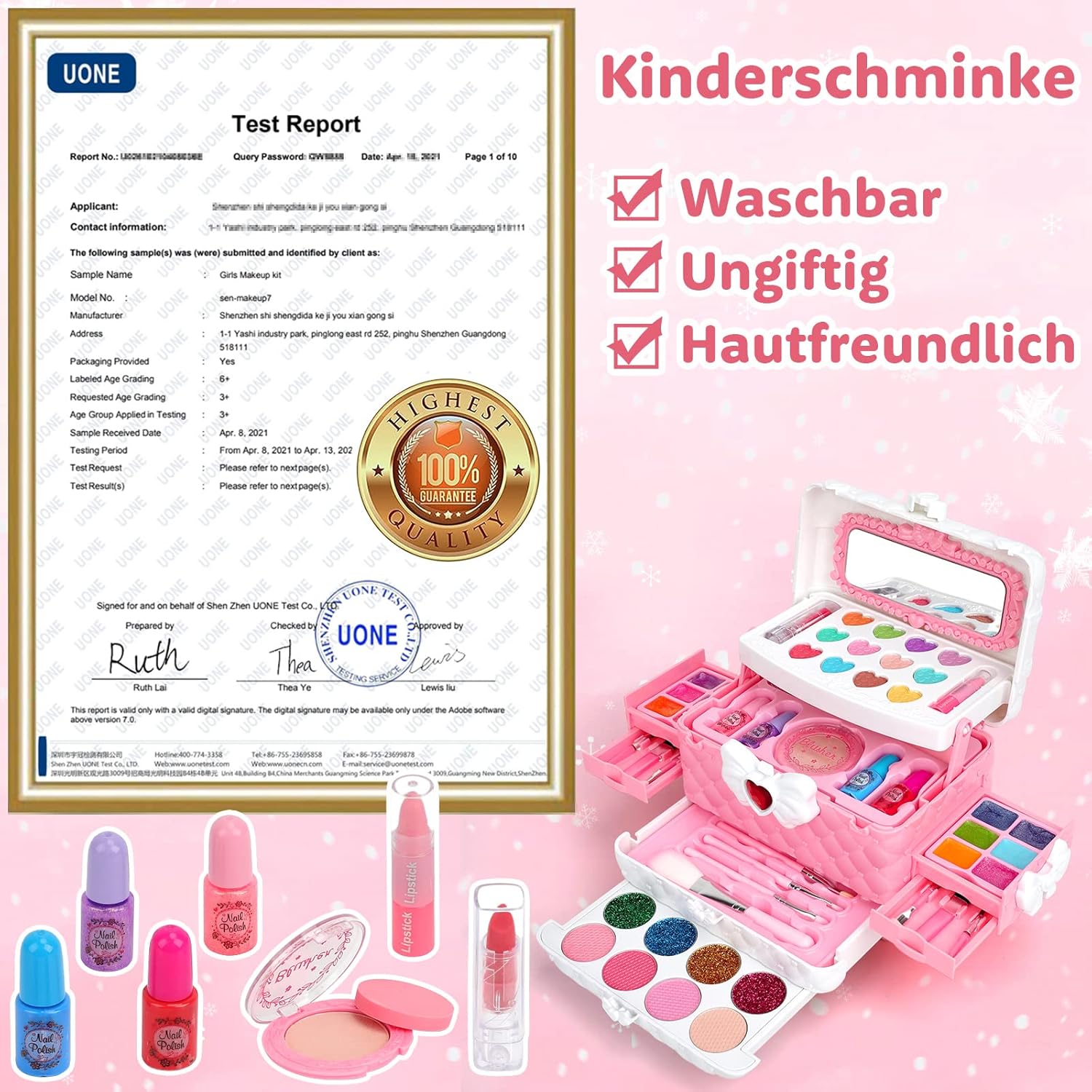 Make-upkoffer voor meisjes: de kinderschminkset bestaat uit veilige en hoogwaardige in water oplosbare ingrediënten, die afwasbaar, huidvriendelijk en ideaal is voor de zachte kinderhuid. Deze make-upset garandeert een veilig gebruik voor je schatten en kan bovendien gemakkelijk met water en zeep worden afgewassen.