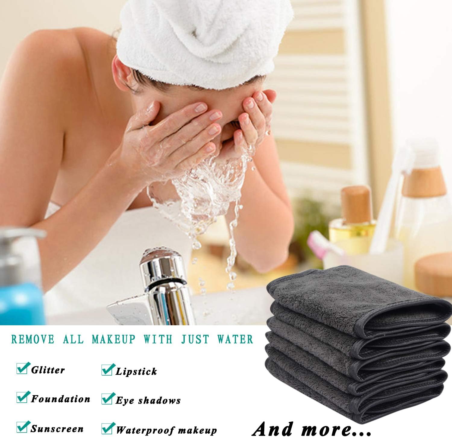 Alleen met water: alleen met water kan onze microvezeldoek voor make-up remover cosmetica, oogschaduw, foundation, lippenstift, zonnebrandmiddelen, inclusief waterdichte cosmetica verwijderen. Als je graag een make-up remover gebruikt, zal het beter zijn