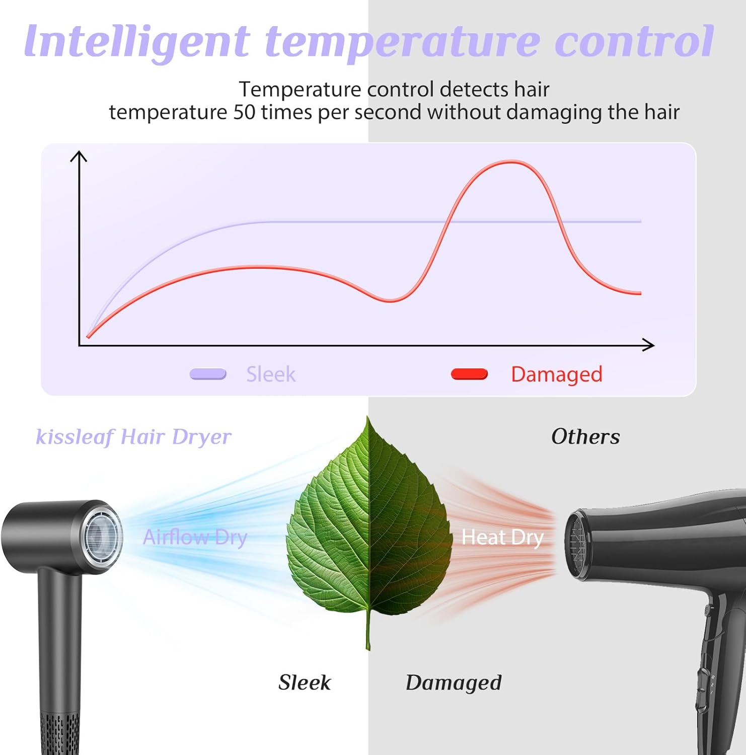 KISSLEAF Haardroger met 200 miljoen negatieve ionen, 110.000 omw/min, snelle droging, 360 graden magnetische diffuser, 30 dB, geluidsarm