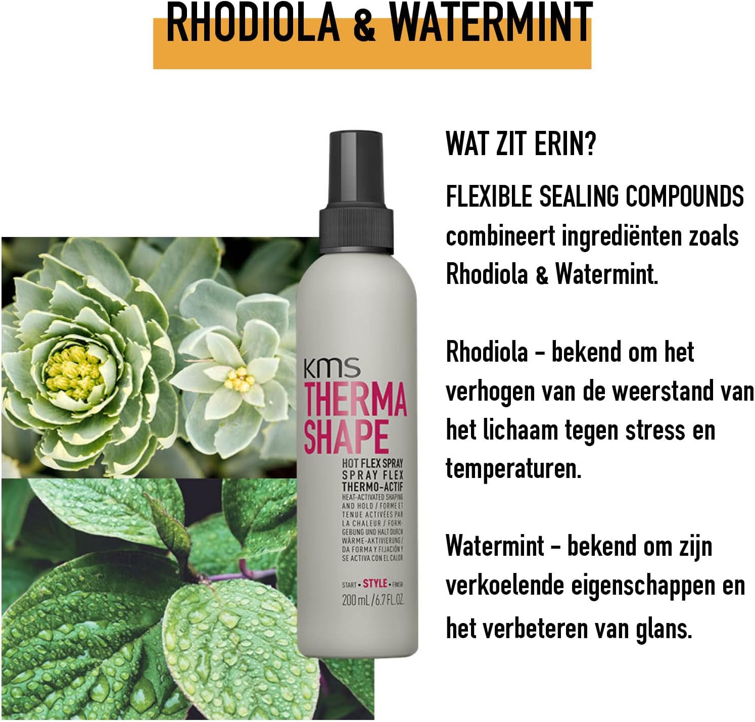 Onze THERMASHAPE Hot Flex Spray bevat Rhodiola bekend om de weerstand van het haar tegen stress en temperaturen te verhogen. Net als Watermint bekend om zijn verkoelende eigenschappen en de verbetering van de haarglans.