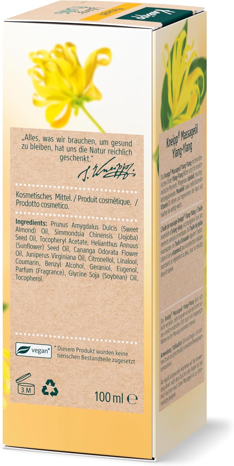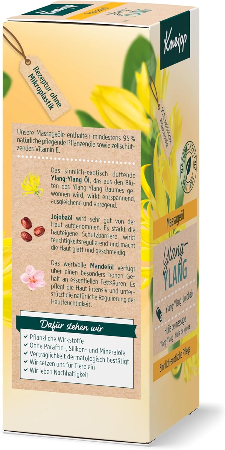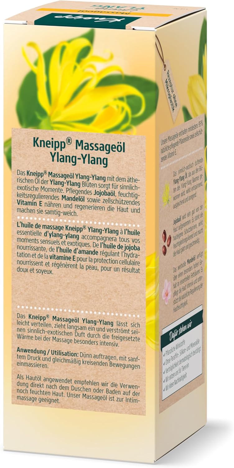Kneipp massage oil ylang-ylang sensual exotic for silky skin. the nourishing kneipp massage oil ylang-ylang is a valuable composition with the essential oil of the ylang-ylang tree, nourishing jojoba oil and moisturizing almond oil and is enriched with the important skin vitamins A and e