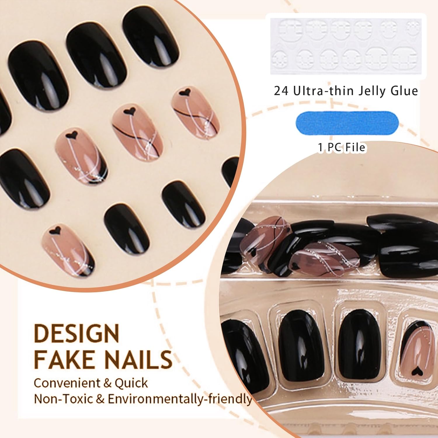 Korte zelfklevende nagels, press-on nagels, ovaal, glanzend zwart hart, nude-roze met gouden glitter golflijn, design valse nagels, 24 stuks