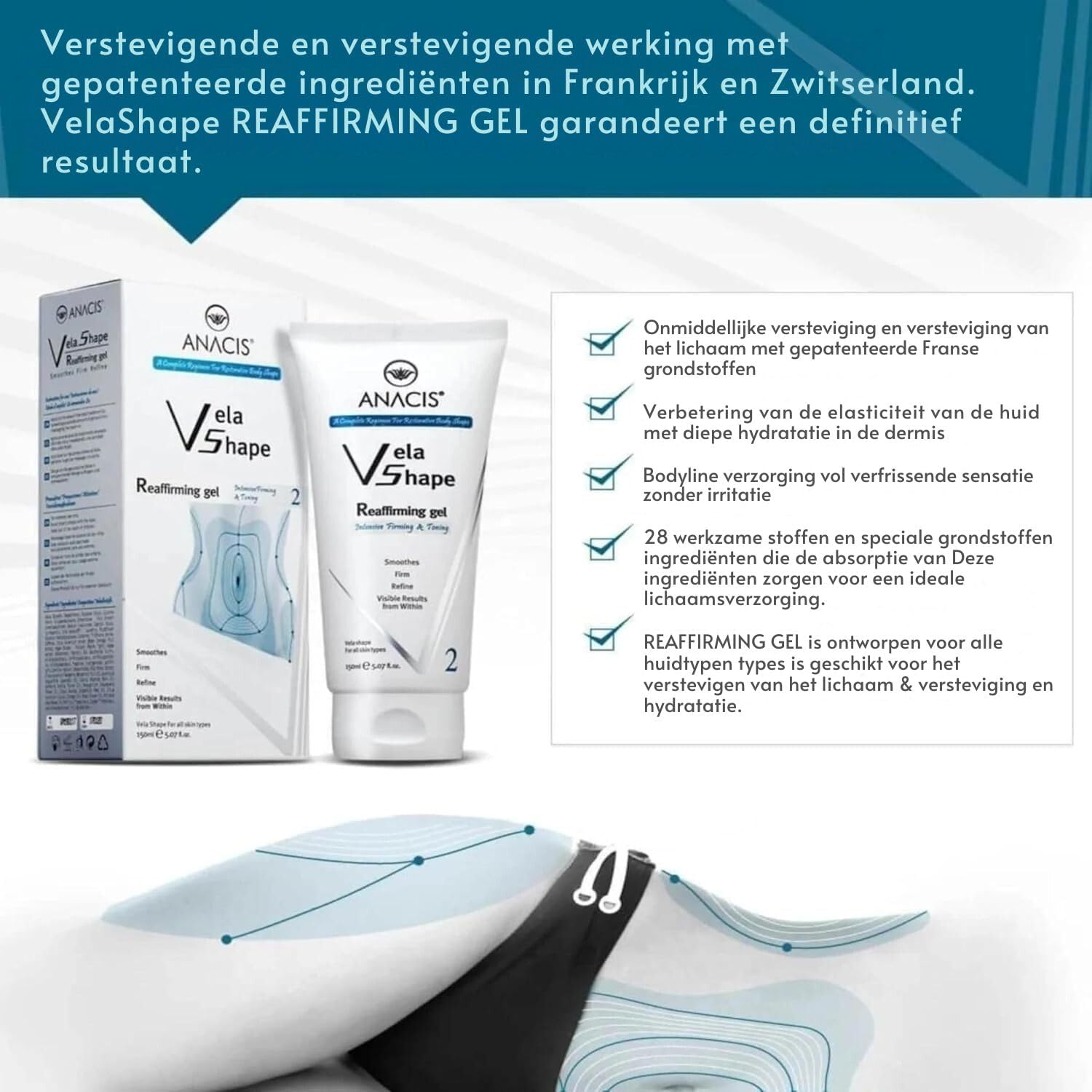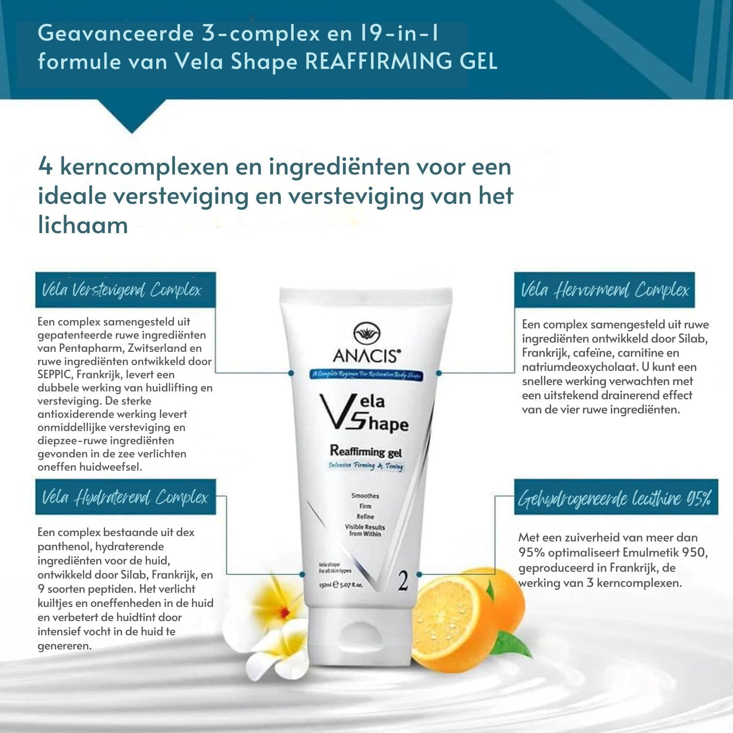 𝐀𝐧𝐚𝐜𝐢𝐬 Vela Shape Gel is een geavanceerde anti-cellulitisbehandeling die is samengesteld om een ongelijkmatige teint aan te pakken en de lichaamscontouren te verbeteren. Onze cellulitis bodycrème combineert krachtige botanische extracten en peptiden om de verschijning van cellulitis effectief te verminderen. De formule van deze huidverstrakkingscrème voor het lichaam richt zich op een ongelijkmatige teint. Deze body smoothing crème zorgt voor een gladdere en textuur op gebieden zoals heupen, dijen, buik en armen. De huidverstrakkende crème voor de maag bevat Pepha Tight, dat superieure huidverstrakkende effecten biedt, en Kalpariane, dat de productie van collageen en hyaluronzuur verbetert. Deze collageencrème voor het lichaam helpt de elasticiteit van de huid in de loop van de tijd te verbeteren. Bovendien is deze anticellulite crème verrijkt met een verfrissende sinaasappelgeur. Het geeft een verkoelend gevoel dat diep hydrateert en tegelijkertijd uw huid verjongt. Deze anti-aging bodycrème biedt uitstekende hydratatie zonder irritatie te veroorzaken, waardoor uw huid zacht, fluweelachtig en goed gehydrateerd blijft. Onze huidverzachtende crème is geschikt voor dagelijks gebruik en helpt bij het vormgeven van het lichaam, het minimaliseren van rimpels en het verbeteren van de algehele huidtextuur. Anacis Gel is een effectieve oplossing voor mensen die het uiterlijk van hun huid willen verbeteren en een veerkrachtiger en strakker lichaam willen bereiken.