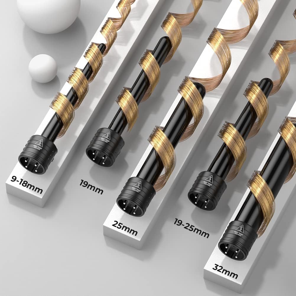 5 verwisselbare opzetstukken: 19 mm/19-18 mm/19-25 mm/25 mm/32 mm. Voor kleine en grote krullen, voor verschillende stijlen.