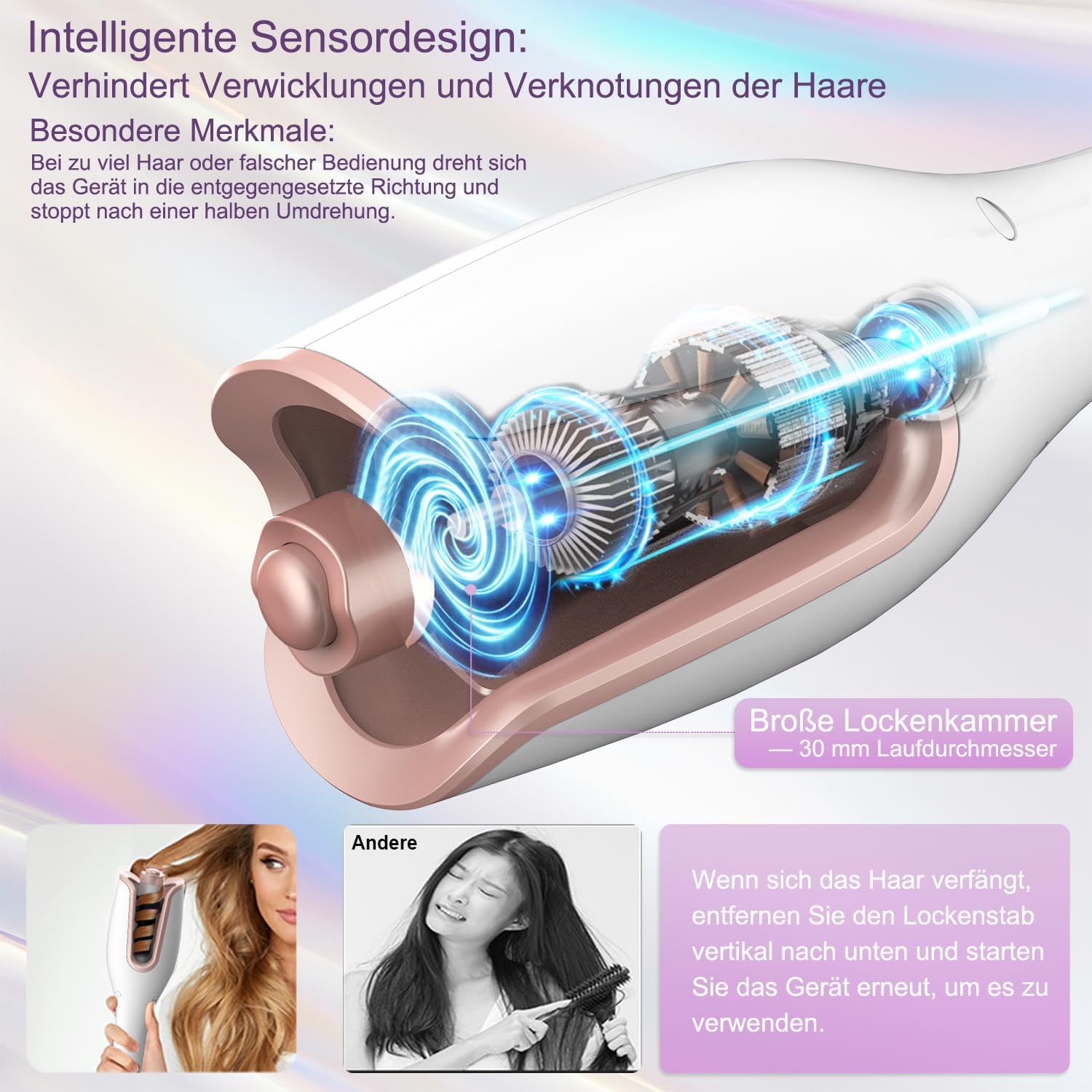 Innovatieve sensortechnologie: als er te veel haar wordt geplaatst of verkeerd wordt gebruikt, stopt de krultang met werken om te voorkomen dat het haar wordt getrokken. Start het apparaat opnieuw op om het gebruik voort te zetten. Nadat de krultang 30 minuten lang niet is gebruikt, schakelt hij automatisch in de stand-bymodus om energie te besparen.