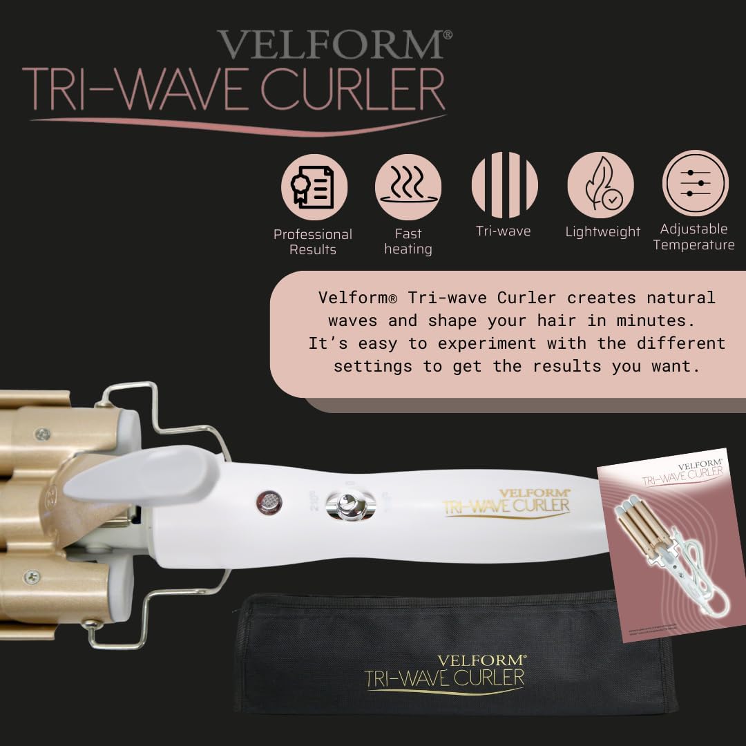 Ontdek Velform Tri-Wave Curler, je bondgenoot om elke dag verschillende kapsels te laten zien. Deze innovatieve krultang maakt het mogelijk om modieuze golven te creëren en past zich aan elke gelegenheid aan, van de meest glamoureuze tot de meest natuurlijke look. Wil je een snelle verandering? In enkele minuten ben je klaar. Dankzij de snelle verwarming en temperatuurregeling kun je je haar snel en eenvoudig stylen om thuis professionele resultaten te bereiken. Je hoeft slechts twee eenvoudige stappen uit te voeren: drukken en loslaten. Met zijn drie vaten van drie keramische lagen zorgt de Velform Tri-Wave Curler voor een gelijkmatige warmteverdeling, wat een snellere styling, minder kroes en meer glans betekent. Bovendien geeft de hoogwaardige keramische coating negatieve ionen vrij, waardoor je haar zichtbaar gezonder en zachter wordt. Of je nu beschadigd, geverfd, dun, medium of dik haar hebt, deze krultang is geschikt voor alle haartypes. Met een instelbaar temperatuurbereik van 80 °C tot 230 °C kun je de warmte naar wens aanpassen. Professioneel en gebruiksvriendelijk ontwerp biedt je veiligheid en comfort. Met een ergonomische, antislip handgreep, geïsoleerde punt en klitvrije kabels die 360 graden kunnen draaien, is het het perfecte hulpmiddel om thuis perfecte kapsels te bereiken. Bovendien beschikt hij over een intelligente uitschakelfunctie, die na 1 uur inactiviteit wordt geactiveerd en je extra rust biedt.