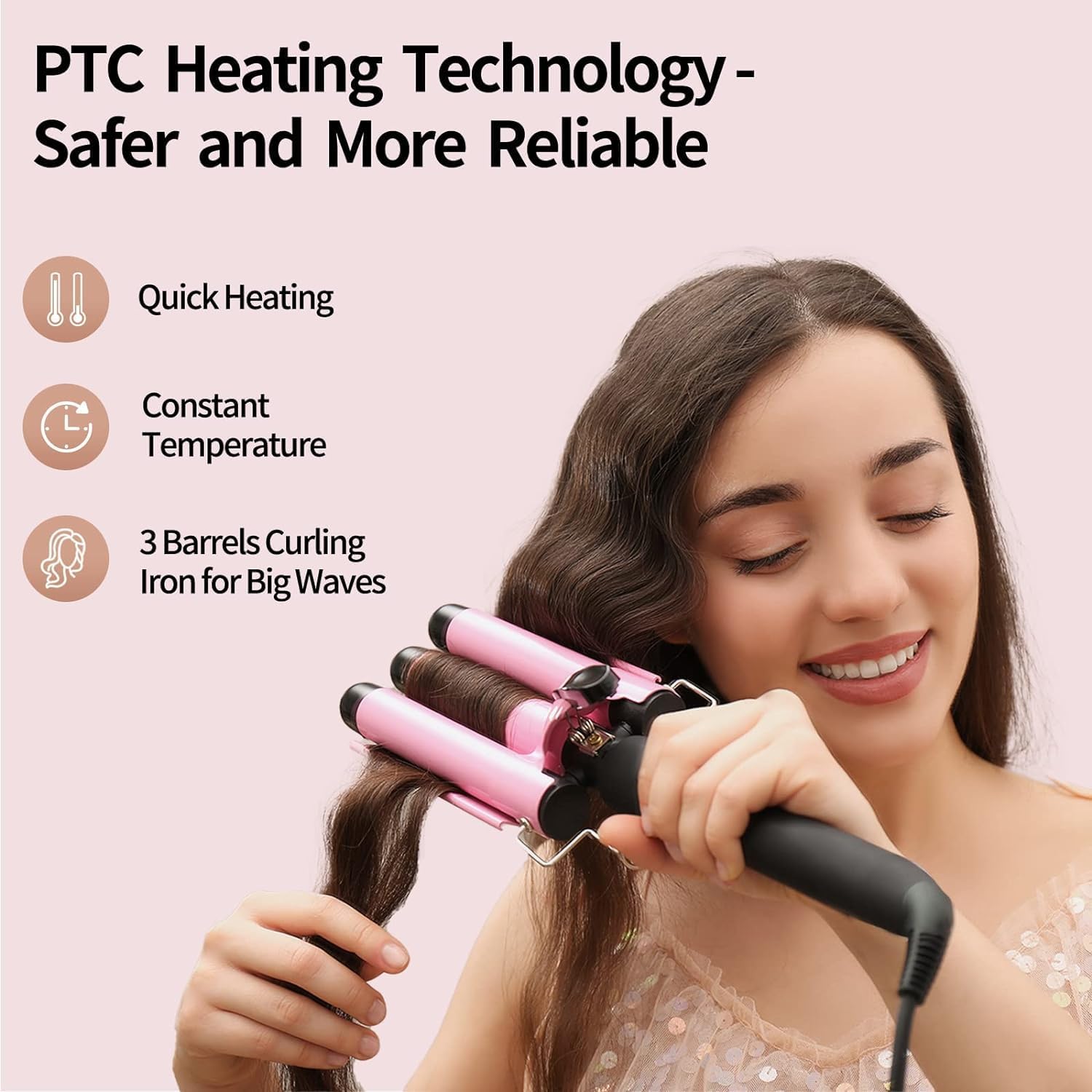 Snel en gemakkelijk krullen: maak perfecte en duurzame strandgolven in slechts enkele minuten met onze stijltang. De PTC-verwarmingstechnologie verwarmt in enkele seconden om je tijd te besparen en je sneller te laten krullen