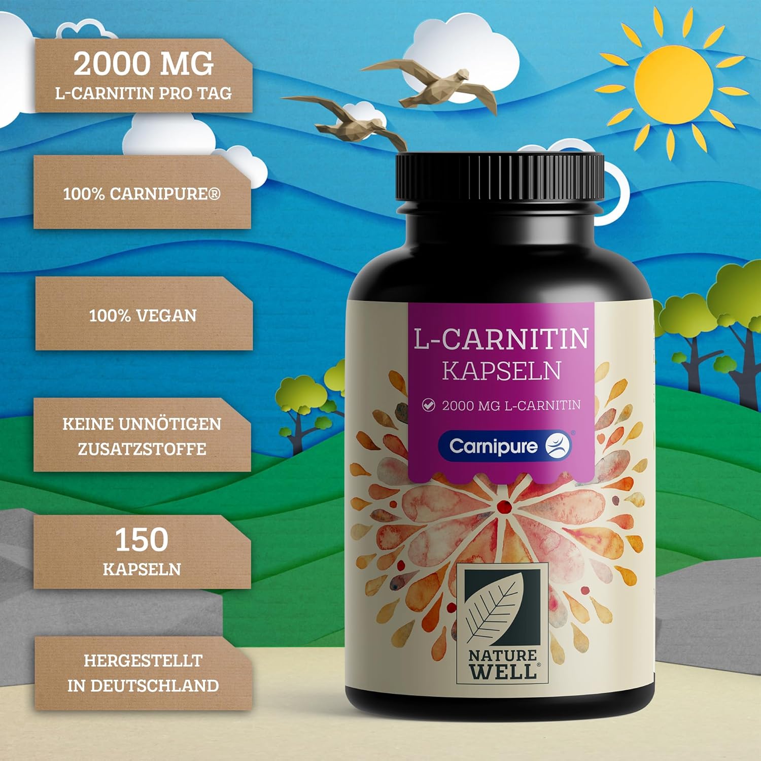 ✅ Veganistisch en zonder ongewenste toevoegingen: de L-carnitinecapsules bevatten geen afwasmiddel of vulstoffen zoals magnesiumstearaat of siliciumdioxide. De L-carnitine wordt puur synthetisch gewonnen en de capsulehoes is gemaakt van plantaardige cellulose in plaats van dierlijke gelatine – de NatureWell L-Carnitine capsules zijn dus 100% veganistisch.