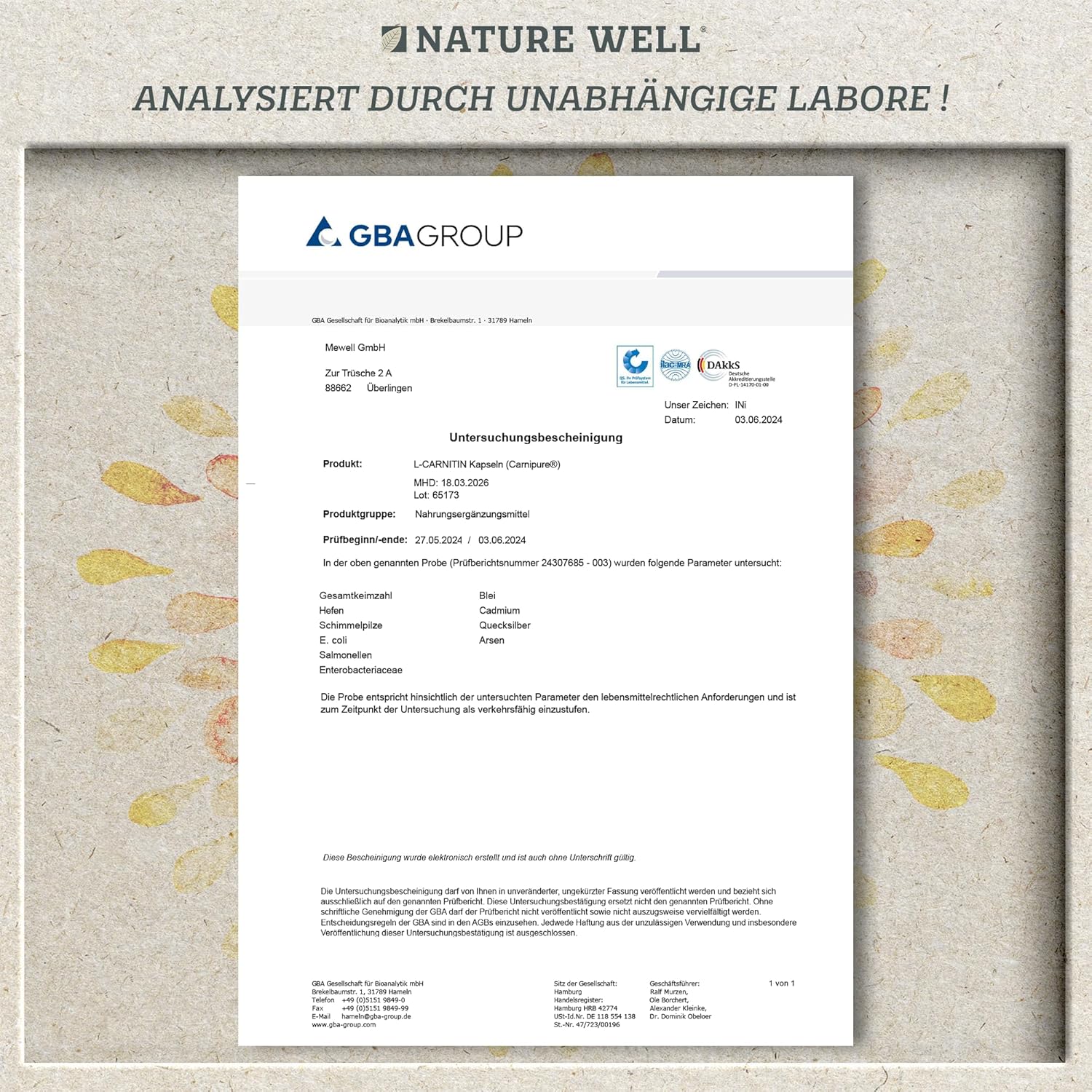Laboratoriumgetest en made in Germany: de L-carnitine-capsules met 100% Carnipure Premium L-carnitine worden uitsluitend in Duitsland geproduceerd en zijn dus onderworpen aan de strenge Duitse richtlijnen voor de productie van voedingssupplementen. Wij laten de capsules regelmatig door een gecertificeerd levensmiddelenlaboratorium onderzoeken en kunnen zo een eersteklas kwaliteit garanderen.