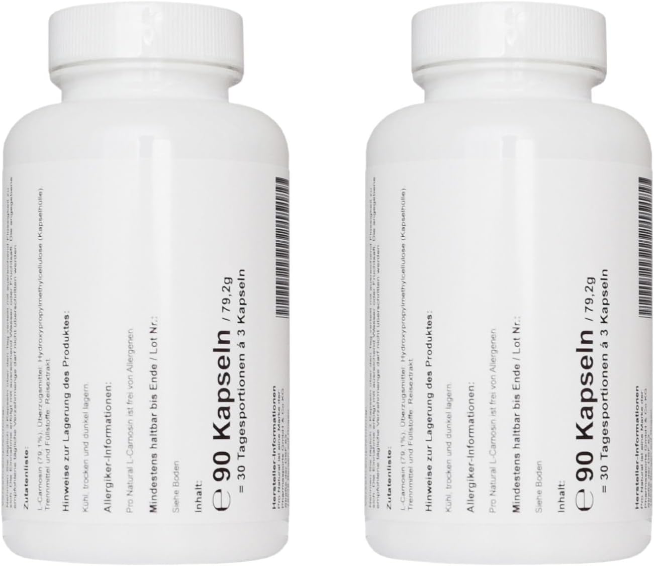 Voordeelpakket 180 capsules (2 x 90 capsules) Pro Natural L-Carnosine – doos van 90 capsules. Pro Natural L-Carnosine is de bron van hoogwaardige L-carnosine in de eenvoudige en comfortabele capsulevorm. Per capsule vind je in dit voedingssupplement 500 mg (milligram) pure L-carnosine. Per doos zijn 90 veganistische capsules inbegrepen, die tegelijkertijd overeenkomen met 30 dagelijkse porties à 3 capsules. Bij de productie van Pro Natural L-Carnosine werd erop gelet dat het product ook voor veganisten en vegetariërs toegankelijk is. Daarom is bij dit product gekozen voor een plantaardige capsulehoes van hydroxypropylmethylcellulose (HPMC).