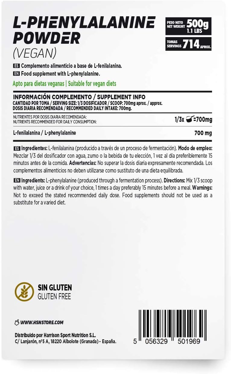 🔝 FENYLALANINE POEDER. Poedersupplement op basis van het essentiële aminozuur L-Fenylalanine in zijn natuurlijke vorm (niet DL-) dat 700mg per dagdosis levert. Essentieel aminozuur verwijst naar wat we met dieet en supplementen moeten ondersteunen.
