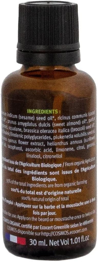 Ecocert Cosmos organisch, 100% van de ingrediënten van natuurlijke oorsprong: deze baardolie is Ecocert Greenlife-gecertificeerd en bestaat voor 100% uit ingrediënten van natuurlijke oorsprong, waarvan 93% afkomstig is van biologische sesamolie, biologische ricinusolie, biologische zoete amandelolie, biologische zoete amandelolie, biologische zoete amandelolie, biologische brouwolie. colizaadolie en Inca-Inchi-olie.
