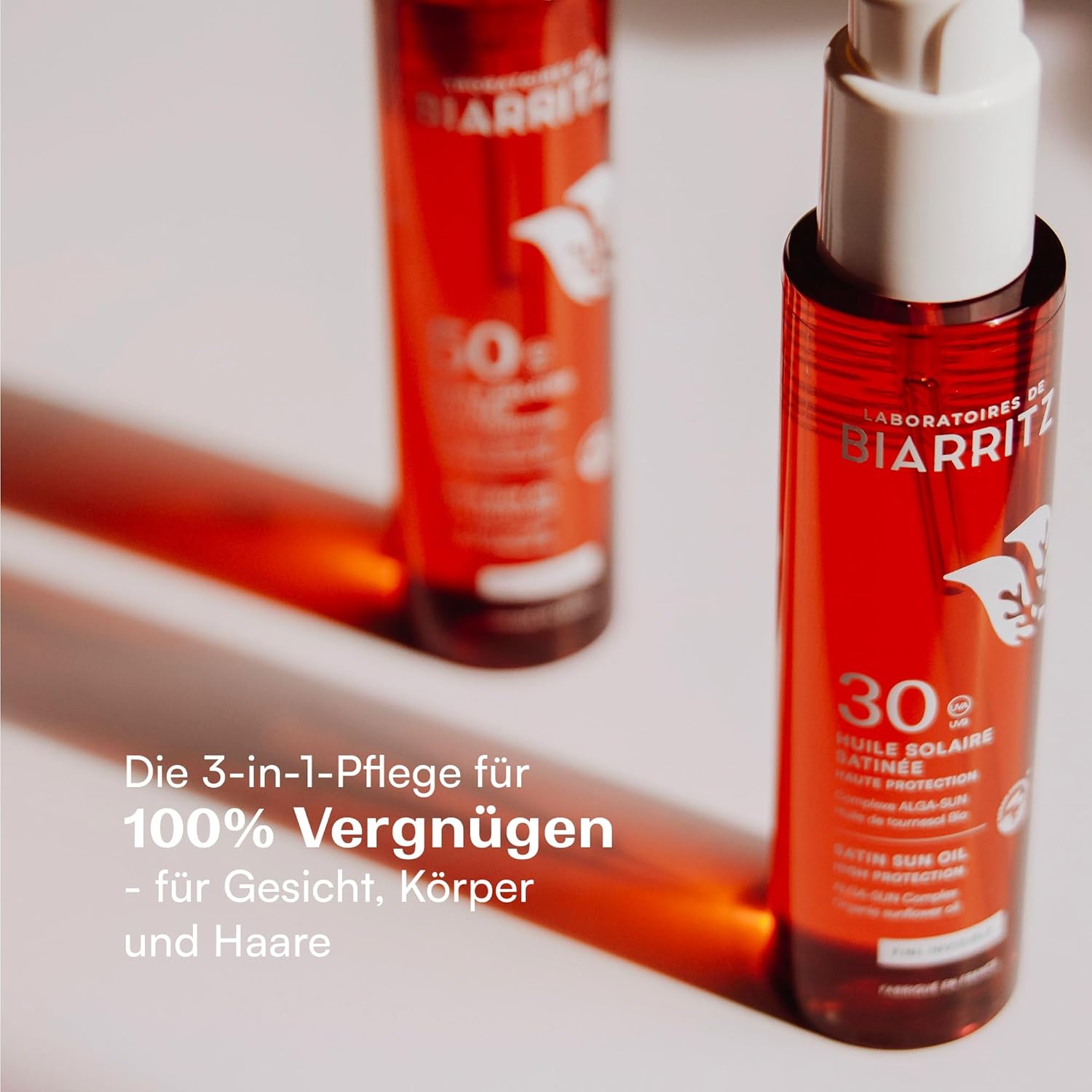 ??? Hoge zonnebescherming, 100% plezier: onze zonneolie LSF 50 verfraait de huid en geeft haar een zijdematte afwerking en een gelijkmatige bruining. Geïnspireerd door de kracht van de oceaan, combineert het een dubbele beschermingstechnologie, alga-sun-protect, twee unieke en effectieve complexen, die een anti-UVA/UVB-bescherming bieden en zo de jeugdigheid van de huid behouden. Formule verrijkt met biologische zonnebloemolie, bekend om zijn voedende eigenschappen. ??? Echte complete verzorging 3-in-1: onze satijnen zonneolie SPF50 kan op gezicht, lichaam en haar worden gebruikt. De onzichtbare textuur is zorgvuldig door ons onderzoeks- en ontwikkelingsteam bewerkt om je een gemakkelijk aan te brengen satijnen afwerking te bieden. De fles is uitgerust met een innovatieve aan/uit-pomp, die ongewenst morsen vermindert. Parfum 100% natuurlijke oorsprong met bloemige en zonnige noten. ??? Formule voor 76% UIT INGREDIËNTEN VAN NATUURLIJKE OORSPRONG: De formule van onze Satin Solar Oil SPF50 bevat geen dierlijke grondstoffen. 20% van de totale ingrediënten zijn afkomstig van biologische teelt. Dermatologisch getest. Geformuleerd voor alle huidtypes. Geschikt vanaf 3 jaar. ?? ?? Gepatenteerde innovatie: Alga-Gorria is een extract van rode algen van de Baskische kust. Het is een sterke antioxidant en neutraliseert vrije radicalen om celschade en huidveroudering door de zon te voorkomen. Patent van Biarritz Laboratories. ??? Frans en engageerd merk: het eerste Franse dermocosmetisch merk, geboren in Biarritz, dat zich laat inspireren door mariene energie en de kracht van zijn algen als belangrijkste werkzame stoffen gebruikt om behandelingen te ontwikkelen, de effectiviteit en veiligheid te combineren en steeds langer te verzorgen, verzorging van alle huidtypes, ook de meest gevoeligste.
