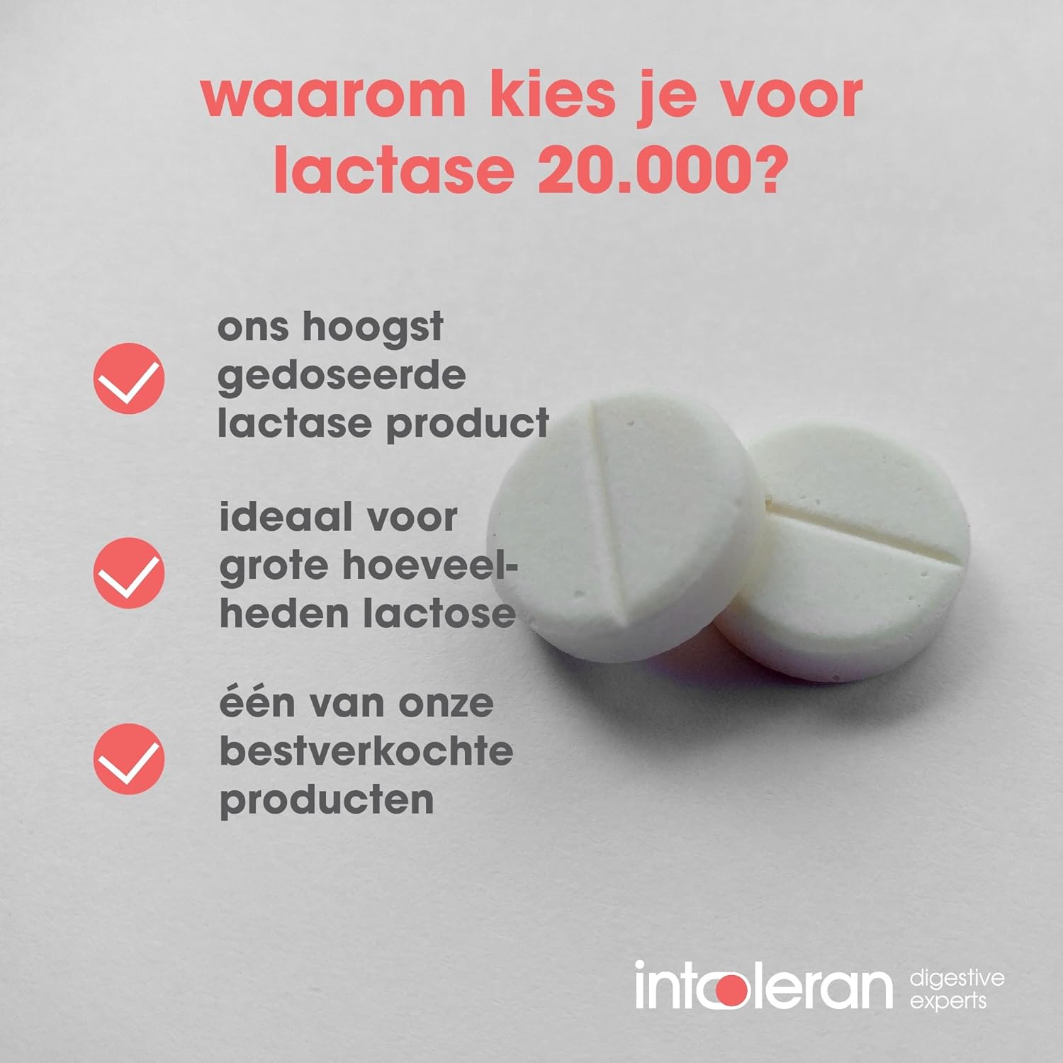 Intoleran Lactase 20.000 enzymen – 50 breektabletten bevat het spijsverteringsenzym lactase. Lactase helpt bij de vertering van lactose uit de voeding.* Lactase 20.000 is ons hoogst gedoseerde lactase product met een dosering van 20.000 FCC lactase. Door de hoge dosering is dit product uitermate geschikt voor het verteren van grote hoeveelheden lactose uit de voeding.