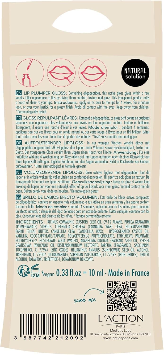 L’Action Paris Lip Plumper Gloss, Natuurlijke Volumegevende Lipgloss met Oligopeptiden voor Vollere Lippen, Transparante Lipgloss met Subtiele Glans, Langdurige en Comfortabele Gloss 10 ml
