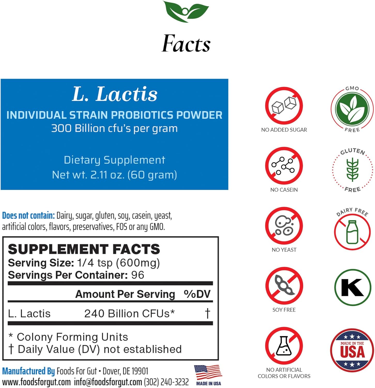 Lactobacillus Lactis Probiotic Powder 300 Billion cfu’s | Made in USA | No Additives | Digestive & Immune Support | High Potency | L. Lactis | 60 Grams (2.11 Oz)