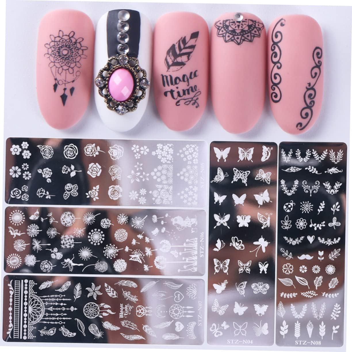 nail stamp template and a variety of patterns to meet your needs and make your nails fascinating and different. Nail printing plate 6 pieces nail art stamping plates which are made of stainless steel materials for use, each piece is deep cut, and it is easy to make a complete pattern the nails