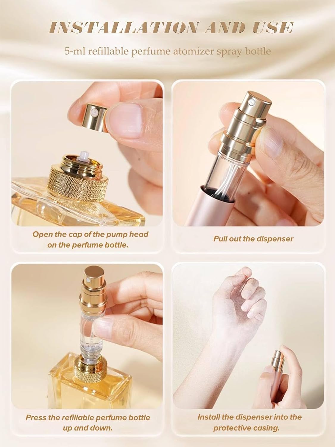 Zo gebruik je de zakstamper: 1. Verwijder de spuitmond uit je parfumfles. Stap 2: Haal de binnenste fles uit de container. Stap 3: Pomp voor het vullen van de verstuiver. Stap 4: Je mini-parfumverstuiver is direct klaar voor gebruik en genieten!