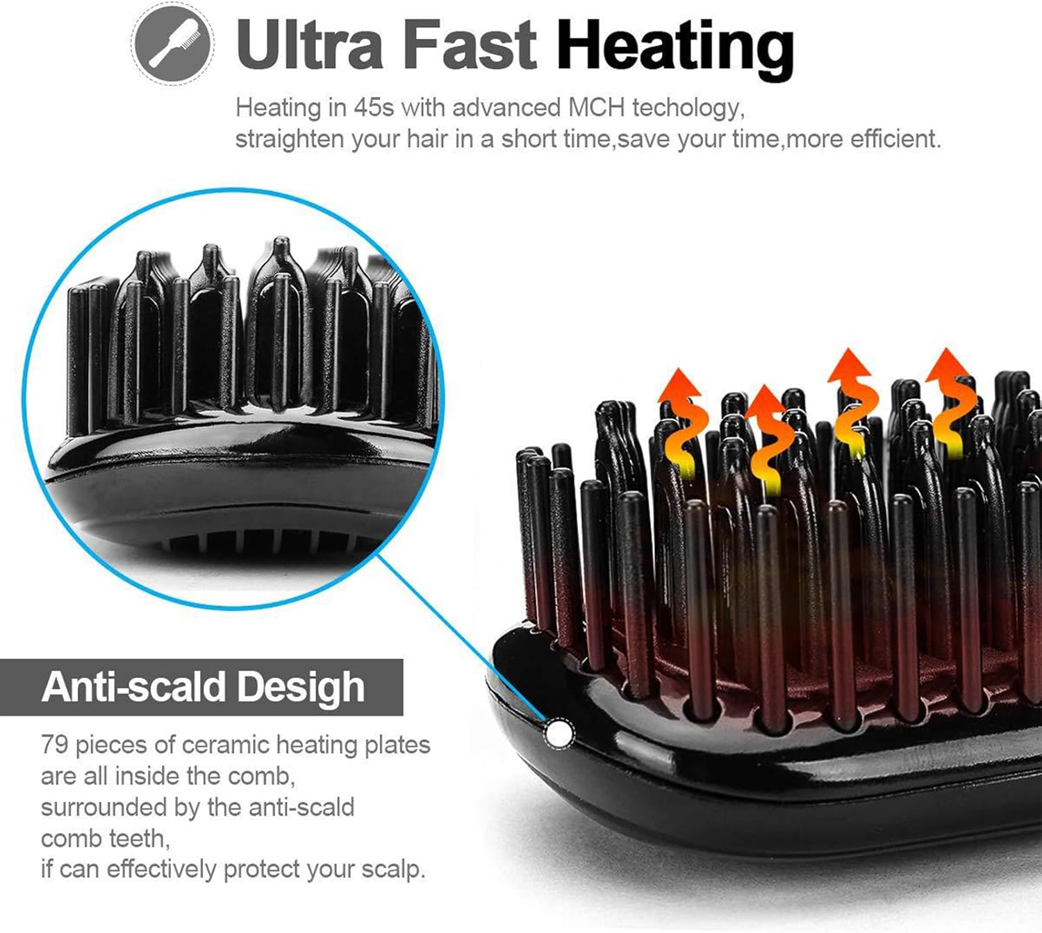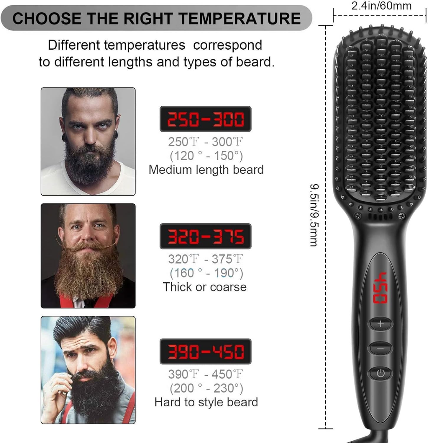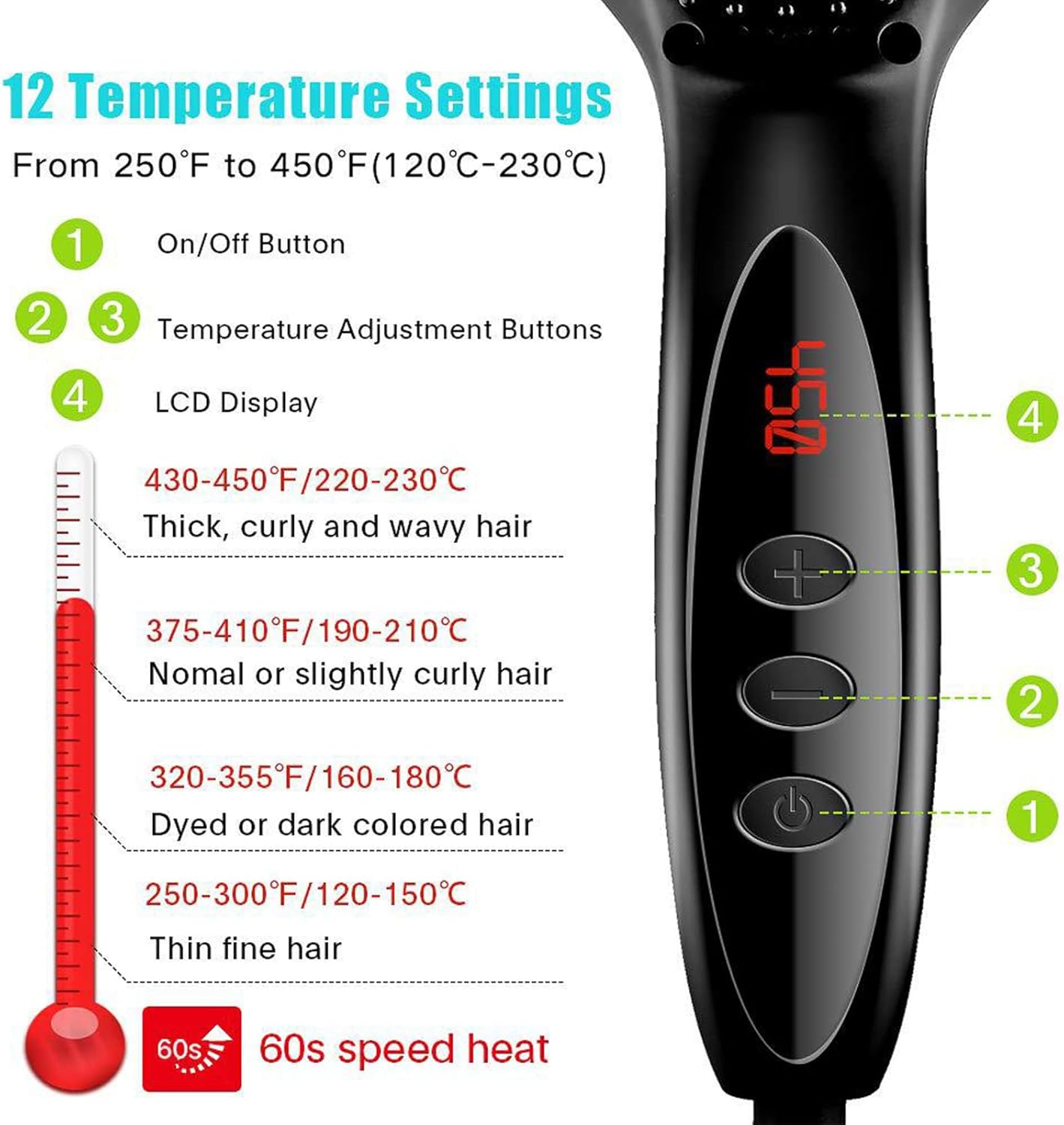 【Rapid Heat】: de stijlborstel maakt gebruik van de MCH-verwarmingstechnologie, hij kan binnen 30 seconden snel opwarmen, de temperatuur kan worden ingesteld van 120 °C tot 230 graden (250 °F – 450 F), wat je haar in korte tijd kan gladmaken, tijd bespaart en de efficiëntie verhoogt. Geschikt voor de meeste haar- en baardtypes.